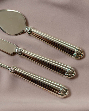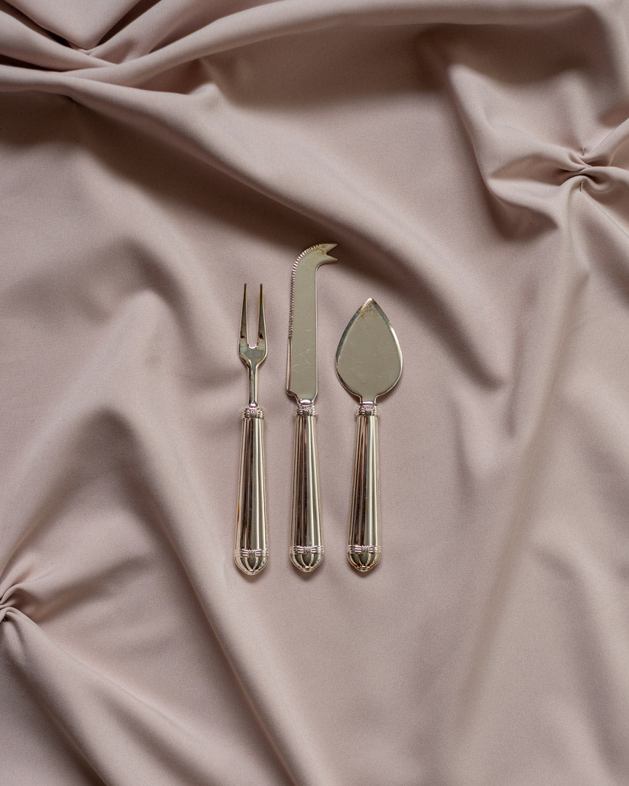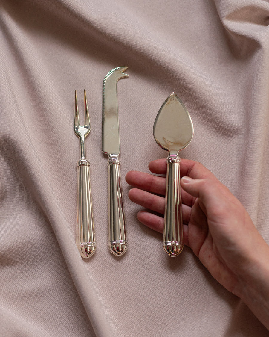 3 klasikinio dizaino, sidabru dengti sūrio serviravimo įrankiai: peilis, mentelė ir šakutė, pagaminti Italijoje.