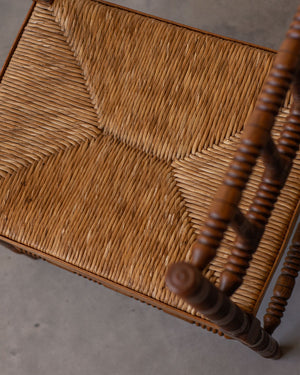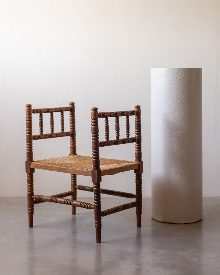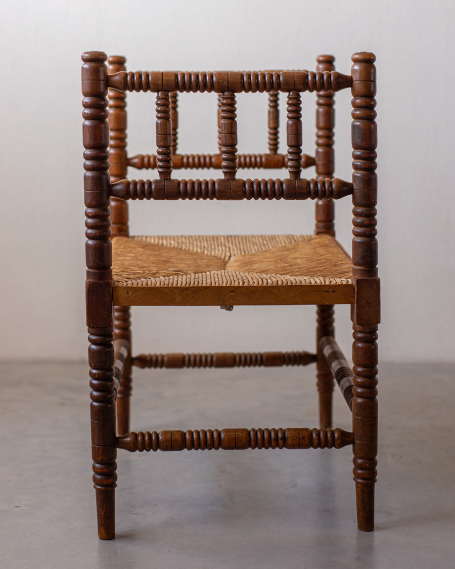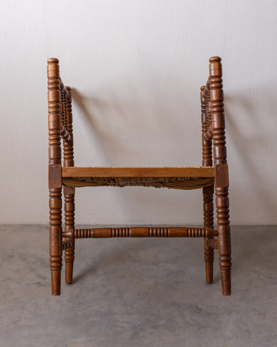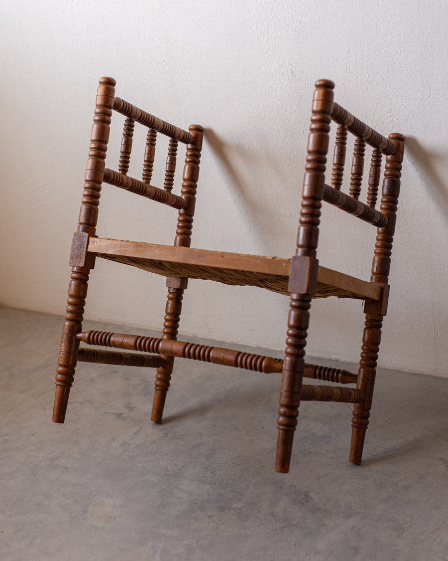 Antikvarinis Bobbin suoliukas pasižymi išskirtiniu dekoratyvumu ir meistriškai drožinėtomis detalėmis, kurios byloja apie XIX a. pabaigos – XX a. pradžios dizaino estetiką.