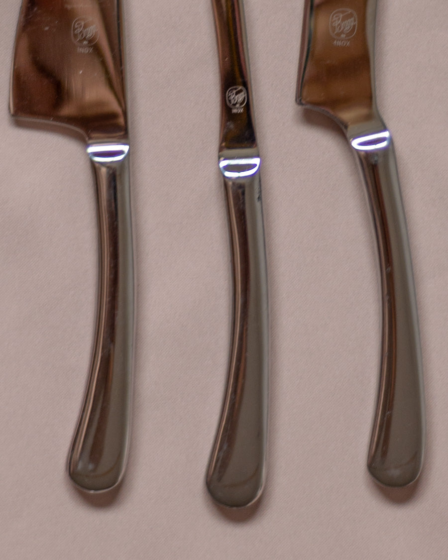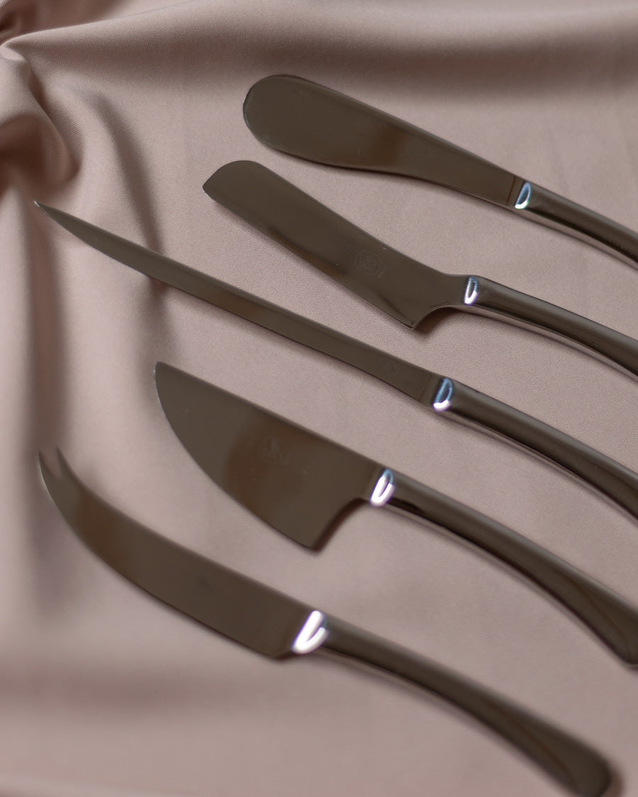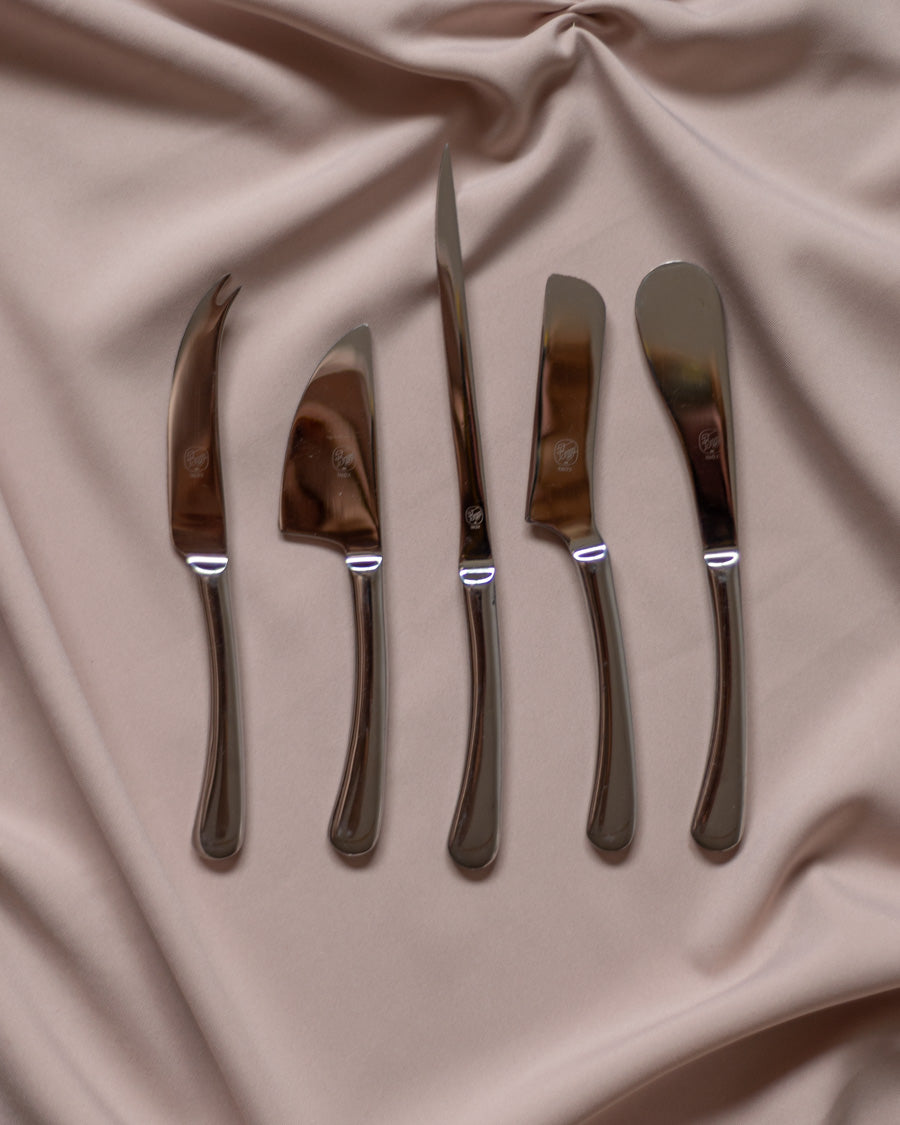 5 skirtingi sūrio serviravimo peiliai, pagaminti iš nerūdijančio plieno.