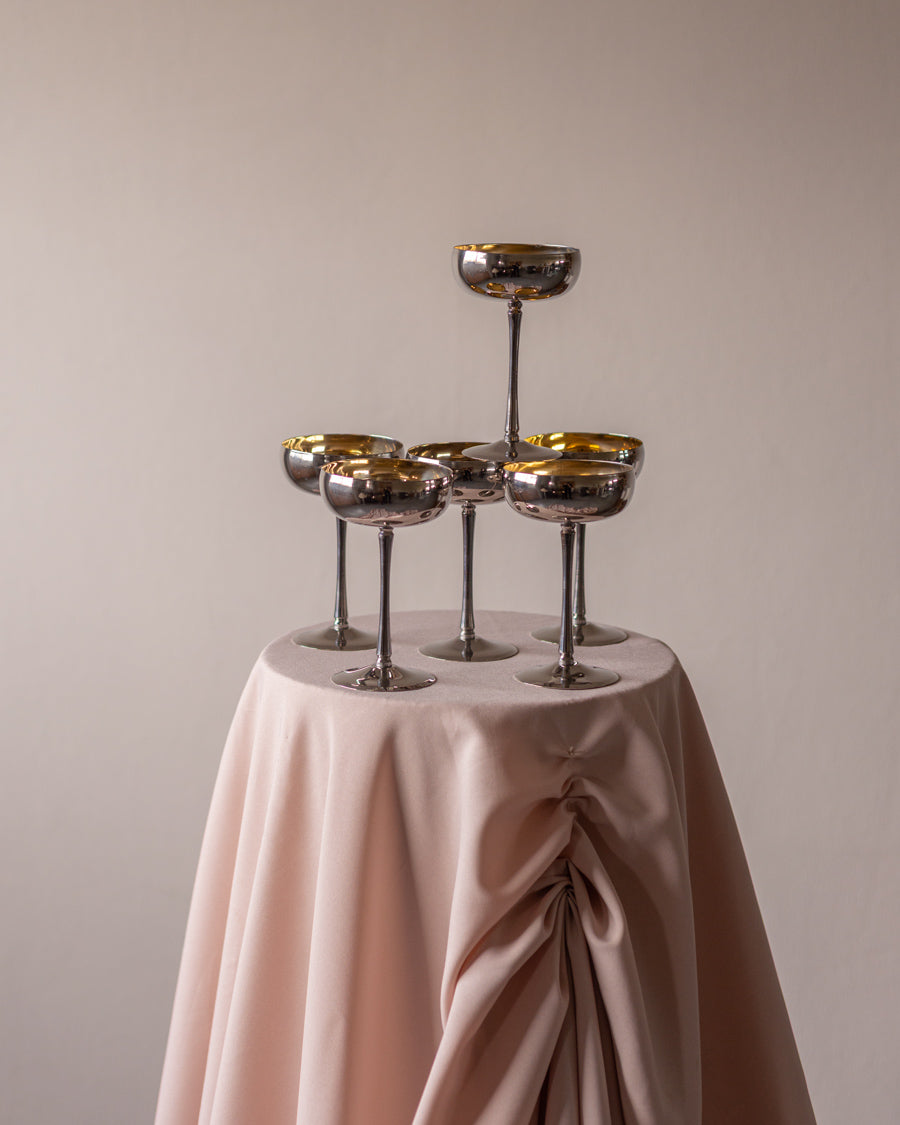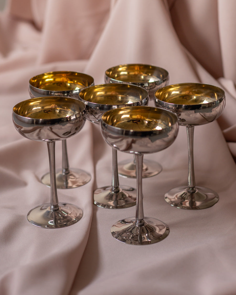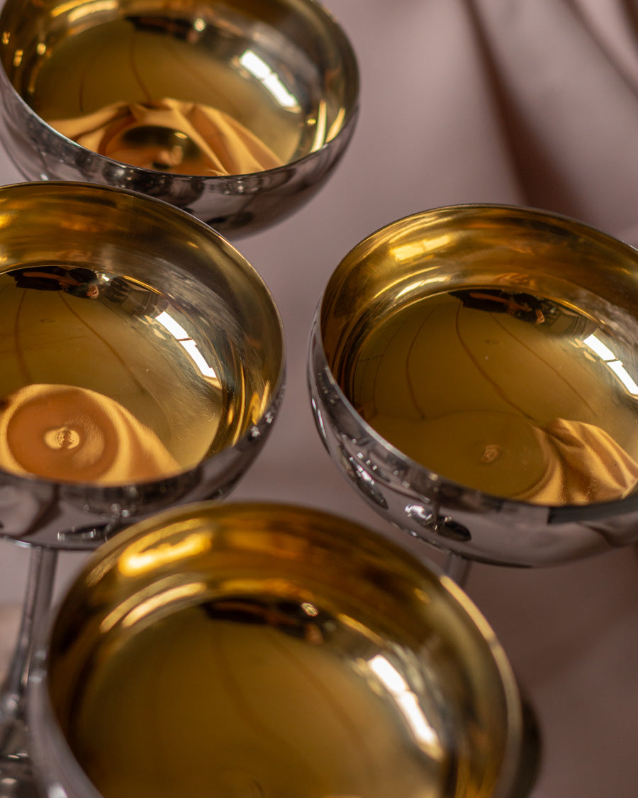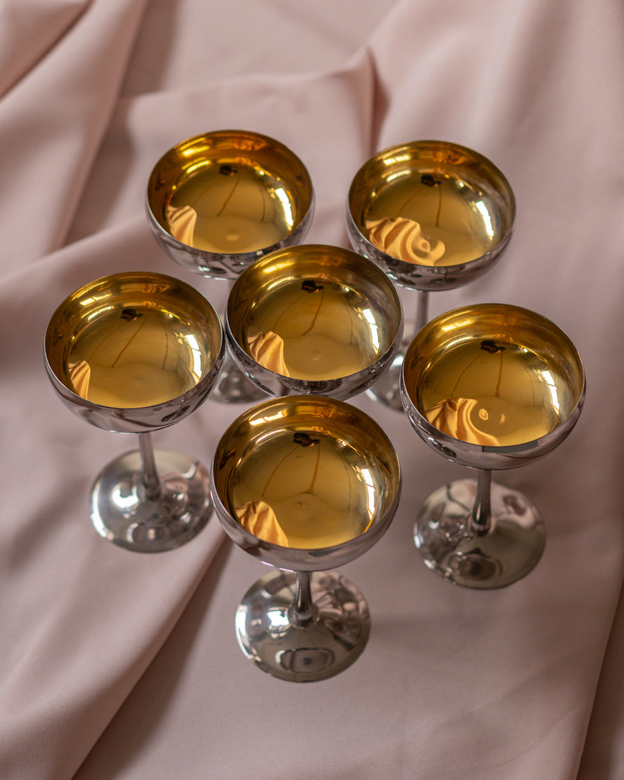 Vintažinės nerūdijančio plieno coupette stiliaus taurės, su auksu dengtomis kojelėmis.