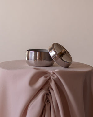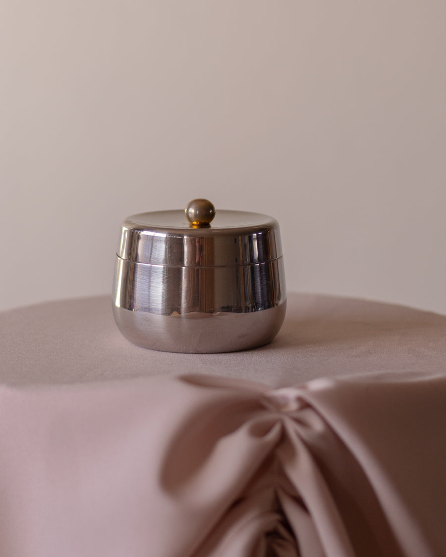 Vintažinė, nerūdijančio plieno cukrinė su paauksuotu rutuliuku.