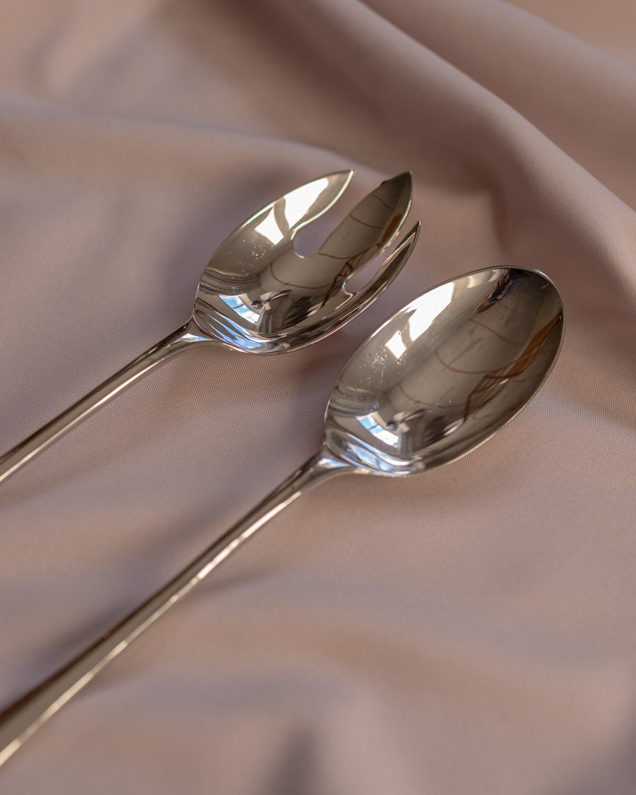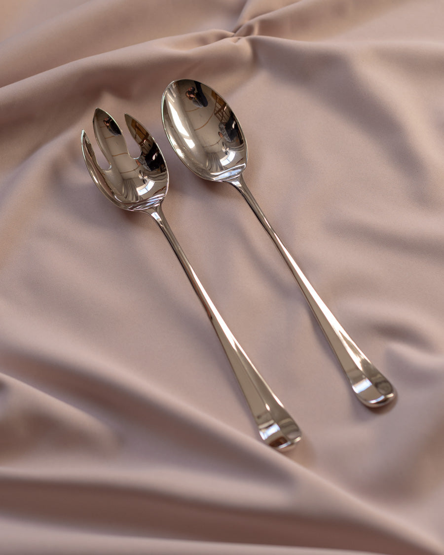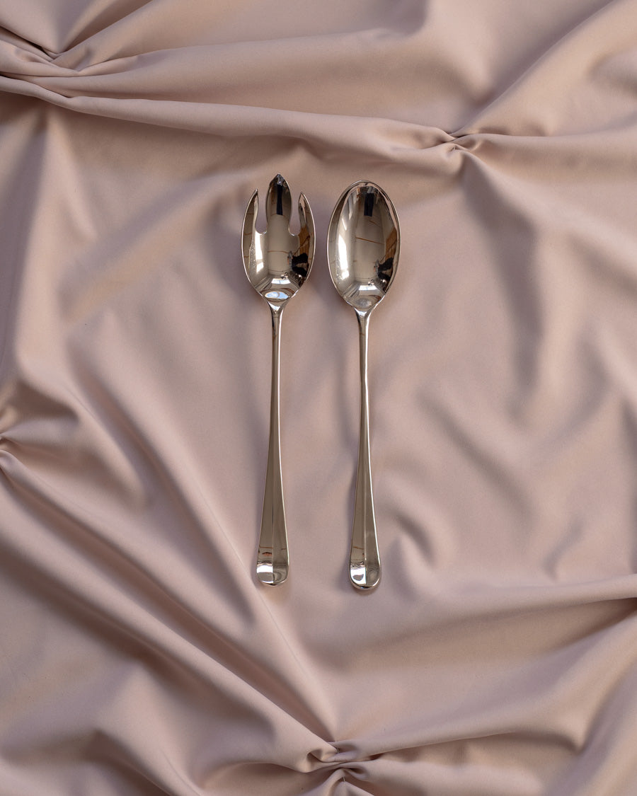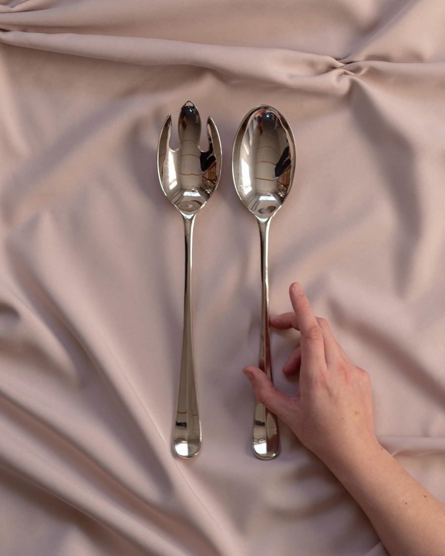 Vintažiniai, sidabru dengti serviravimo įrankiai didesnio, nei įprasto dydžio.