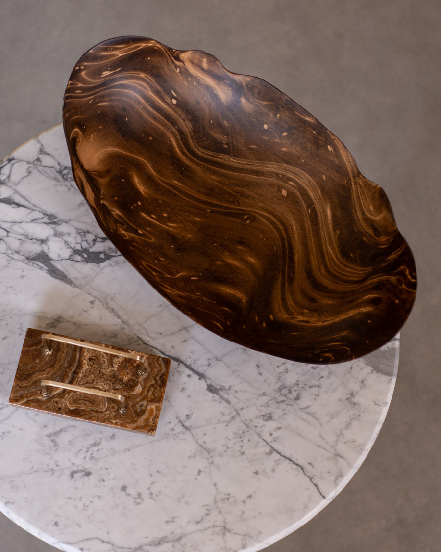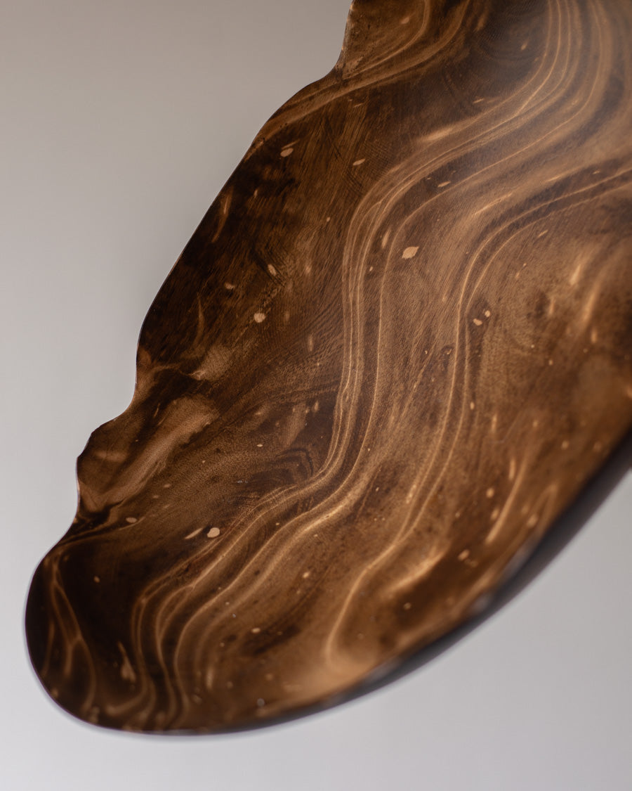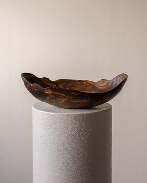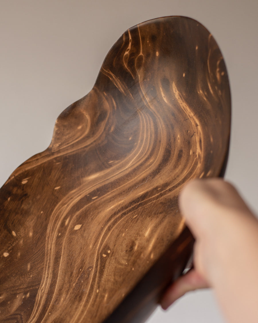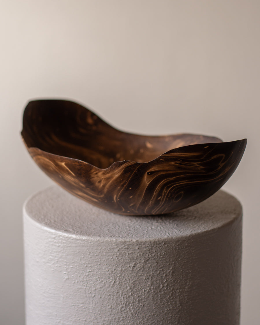 Organiškos formos, iš egzotinės medienos pagamintas dubuo su kontrastuojančiomis medžio gijomis.
