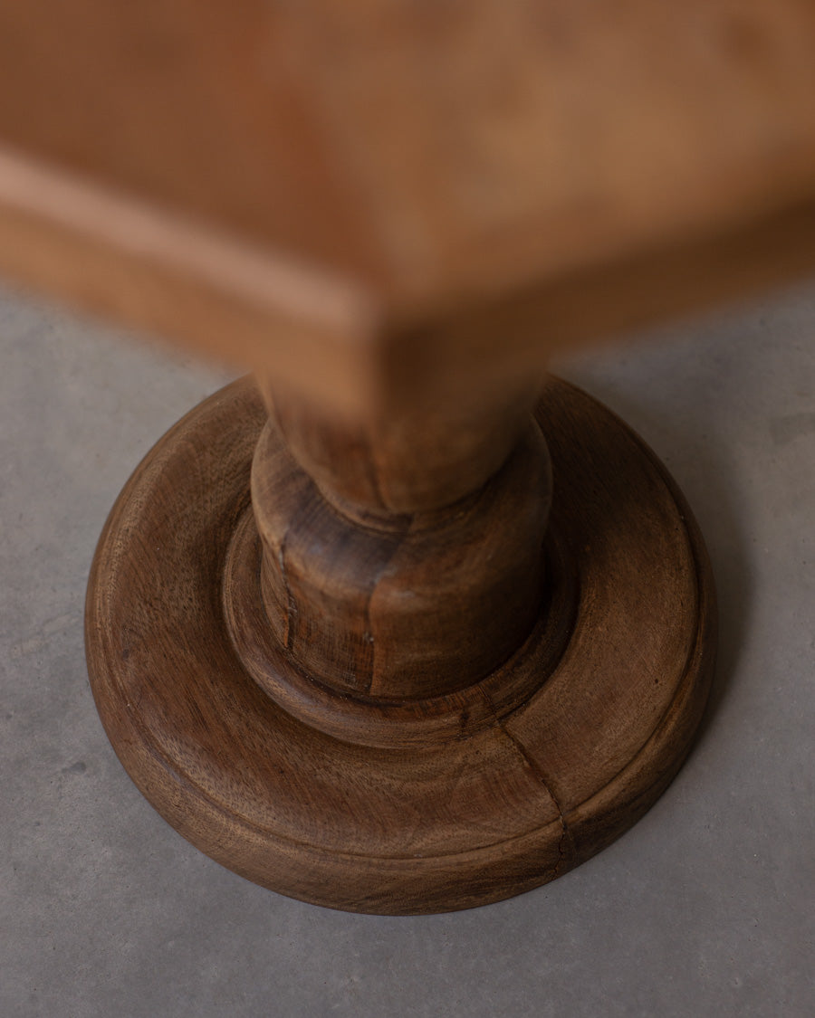 Skulptūriškas, sunkus, iš egzotinės medienos pagamintas šoninis staliukas.