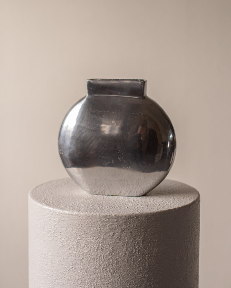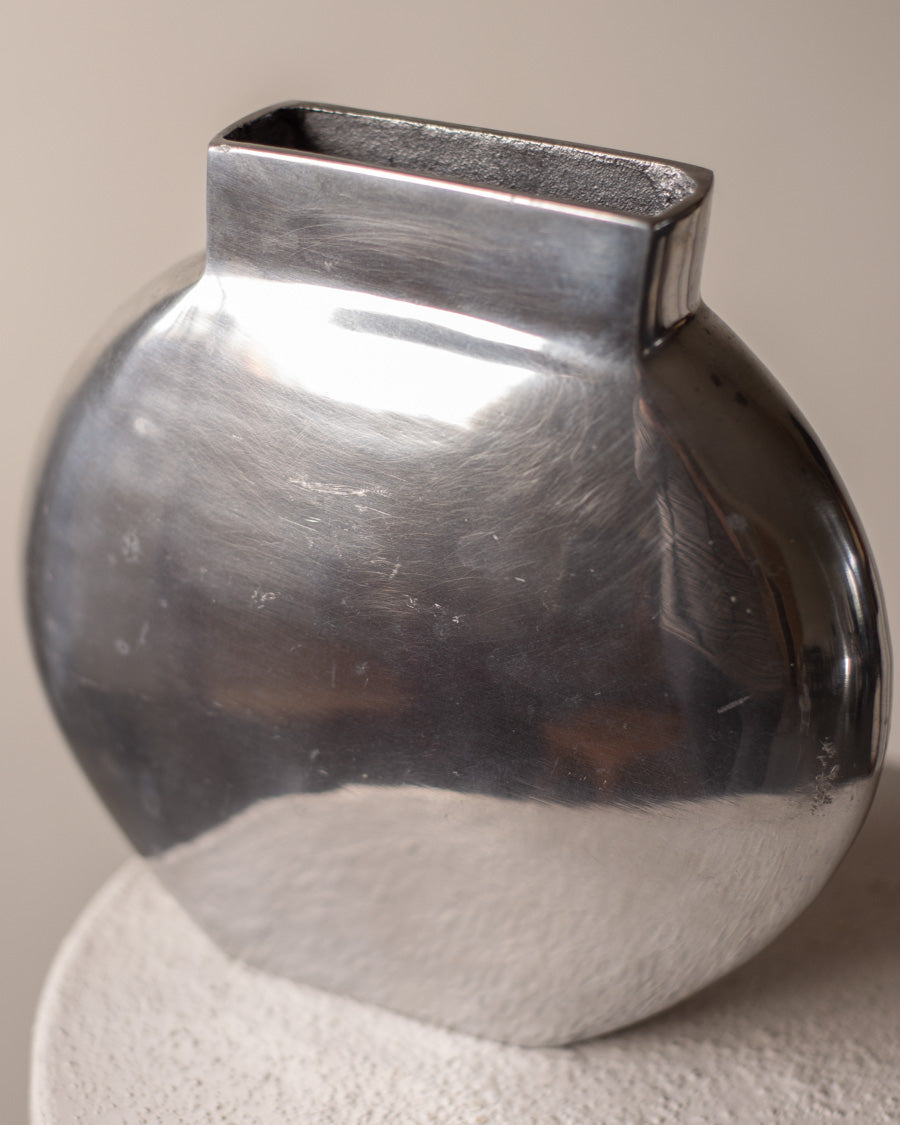 Apskritimo formos, su stačiakampio formos kakliuku vaza, pagaminta iš aliuminio metalo.