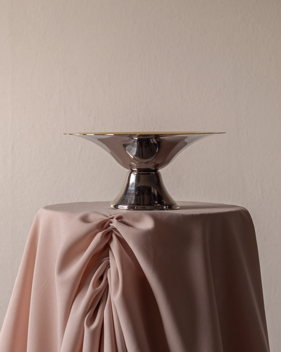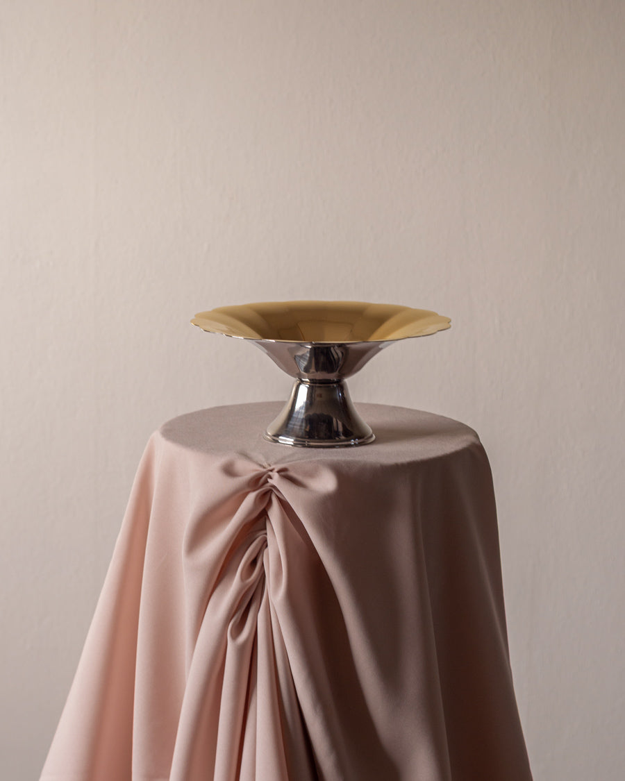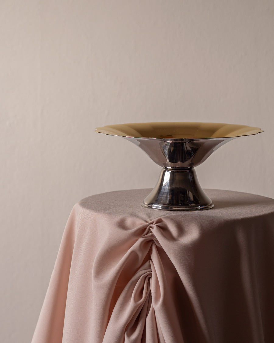 Vintažinis, kampuotų briaunų, nerūdijančio plieno dubuo su auksu dengtomis detalėmis.