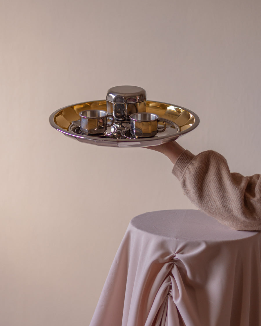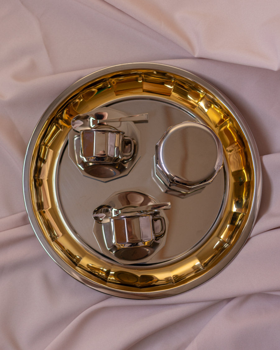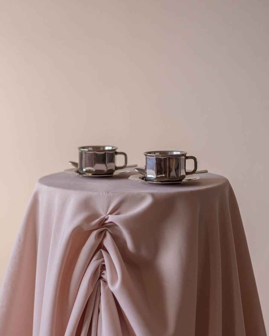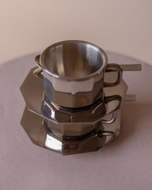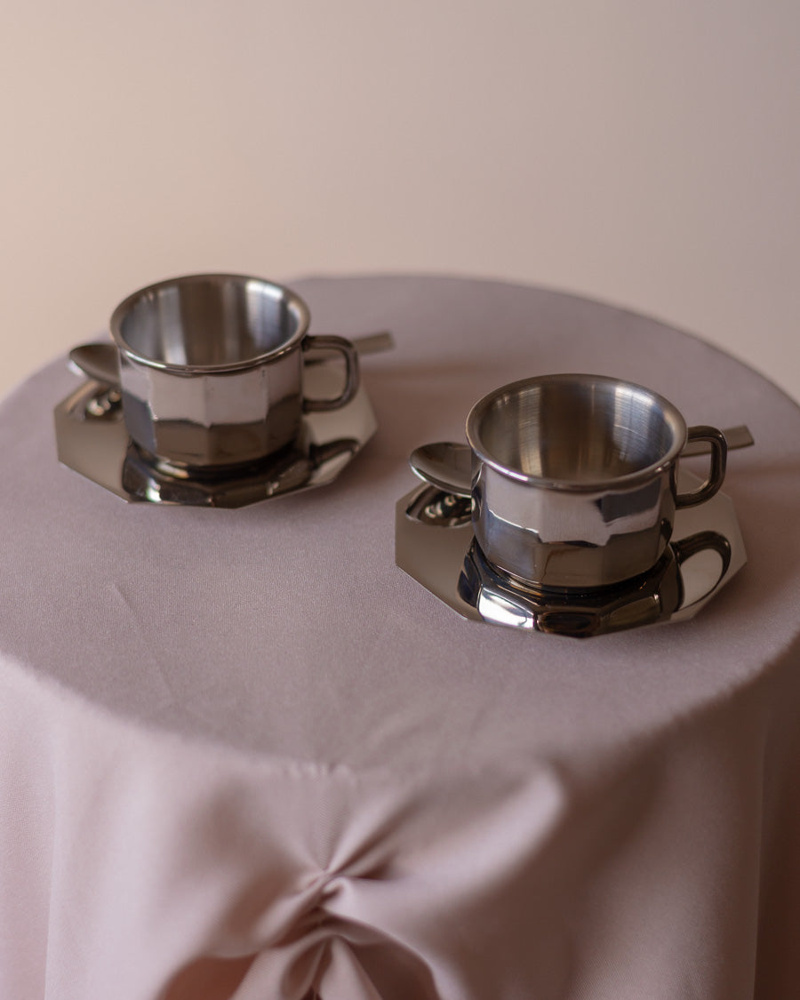 2 vintažiniai, kampuotų briaunų, nerūdijančio plieno puodeliai su šaukšteliais. Pagaminti 9-ąjame dešimtmetyje, italų gamintojo - Gottinghen.