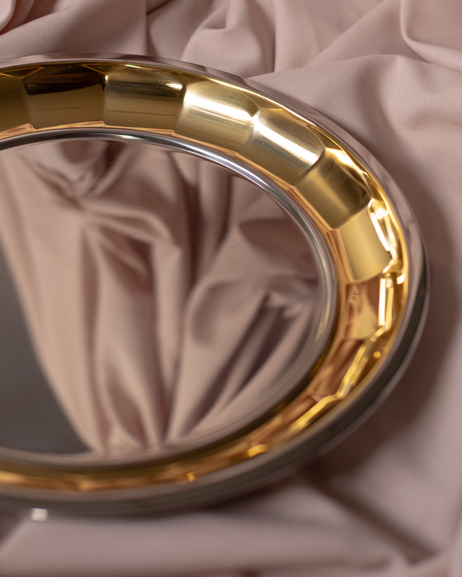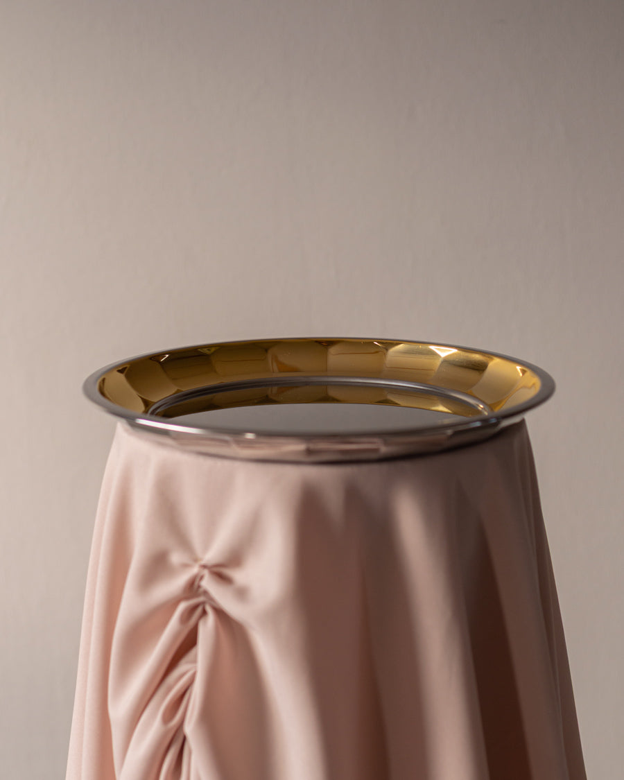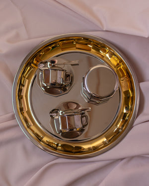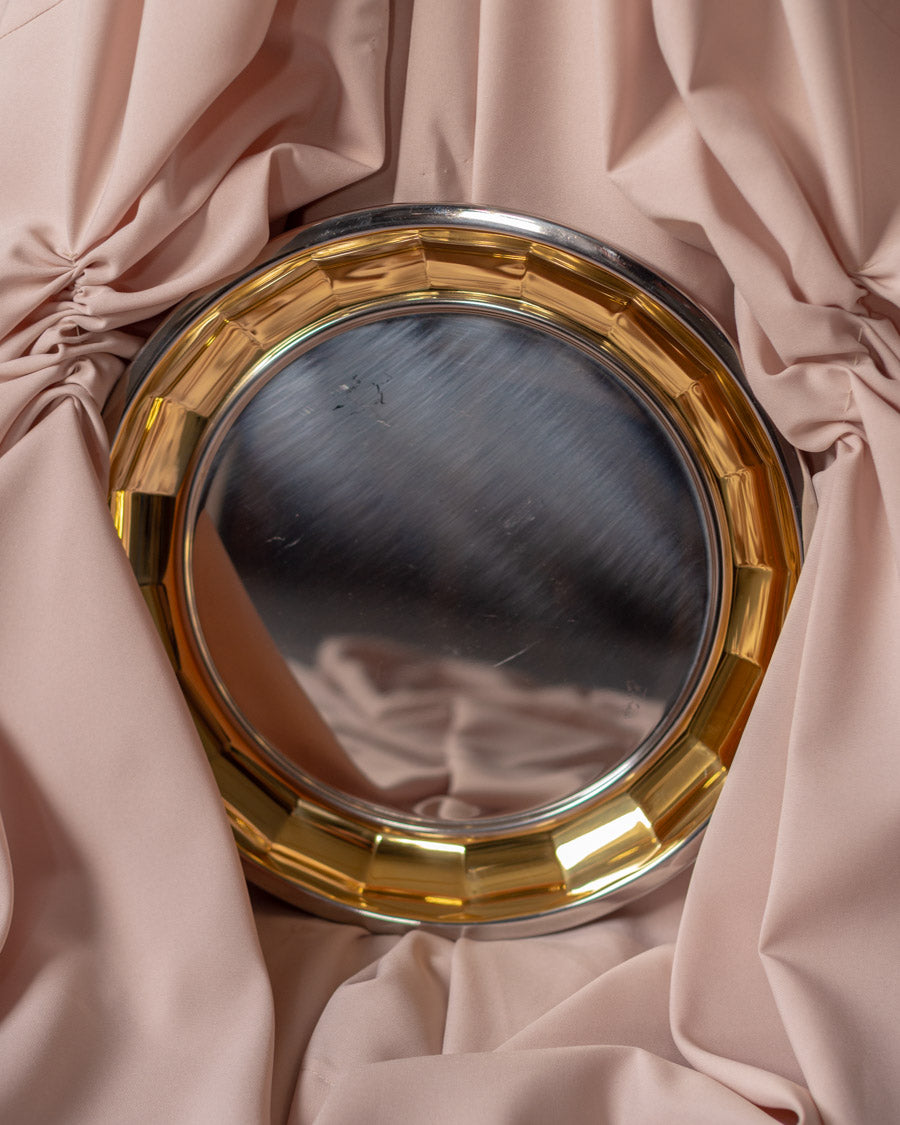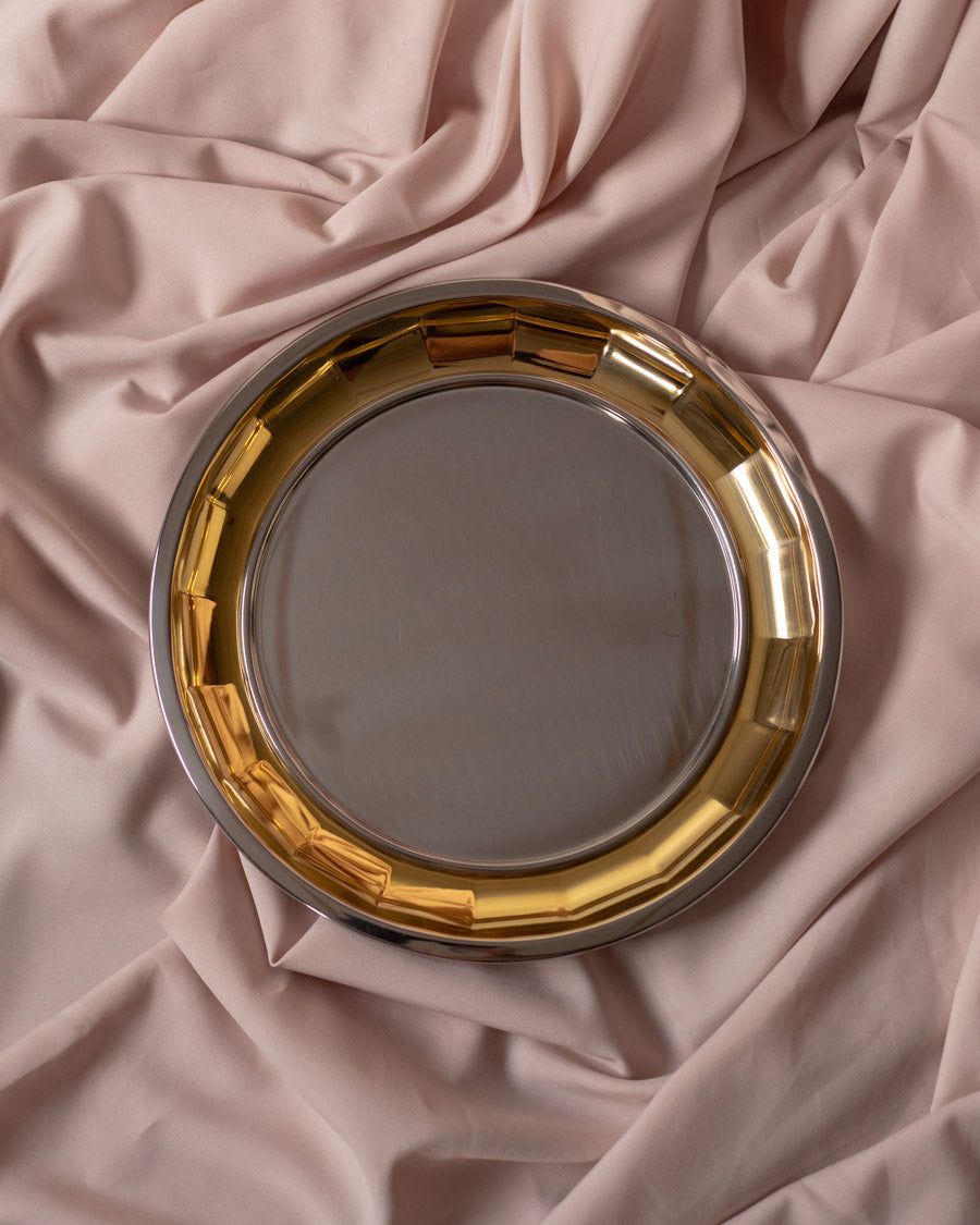 Vintažinis, klasikinio dizaino nerūdijančio plieno padėklas su paauksavimu.