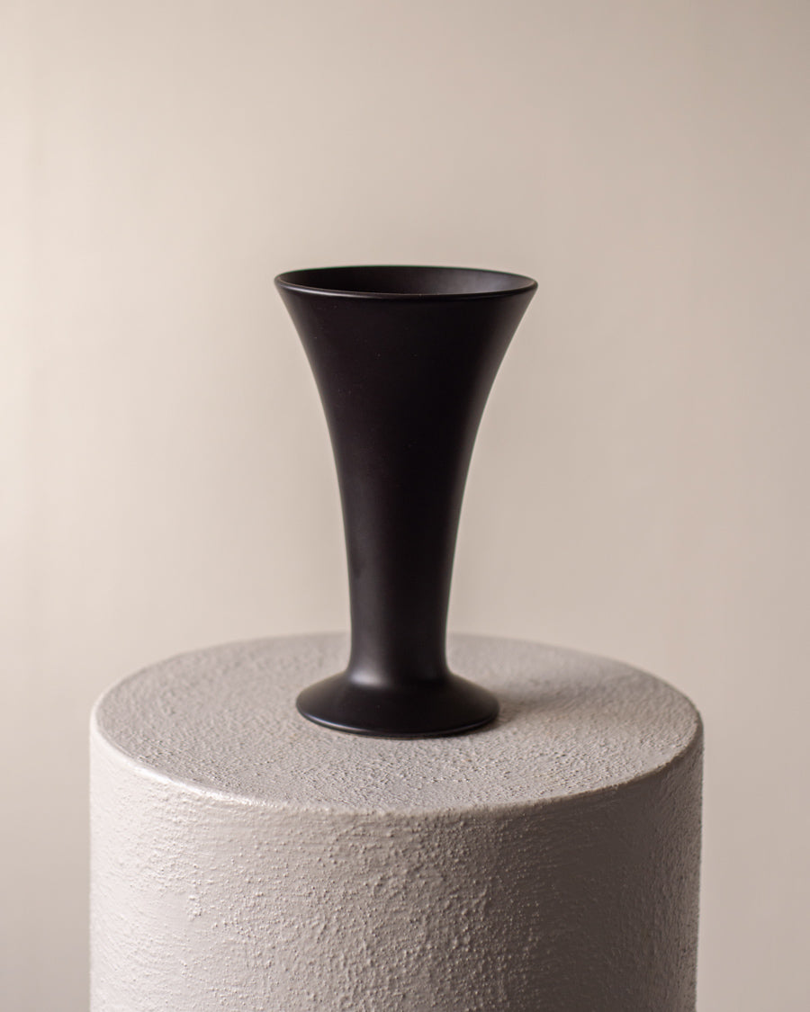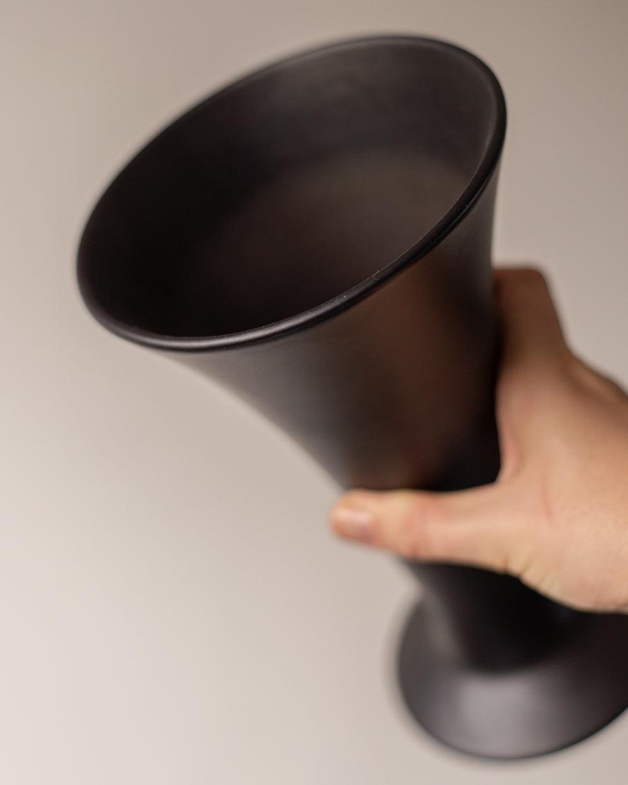 Vintažinė, juodos spalvos, į viršų platėjanti keramikinė vaza.