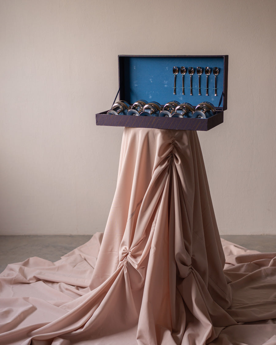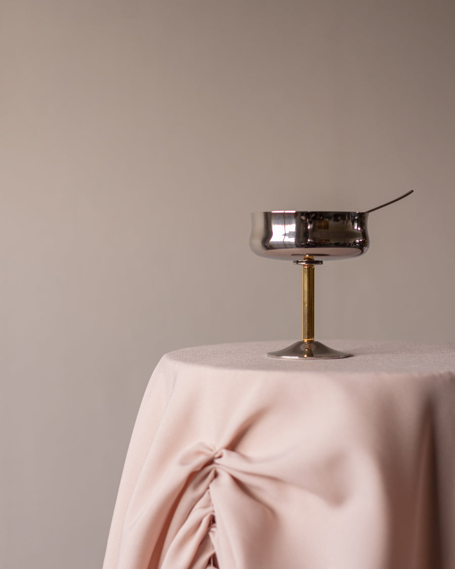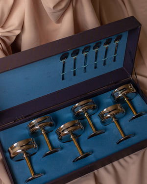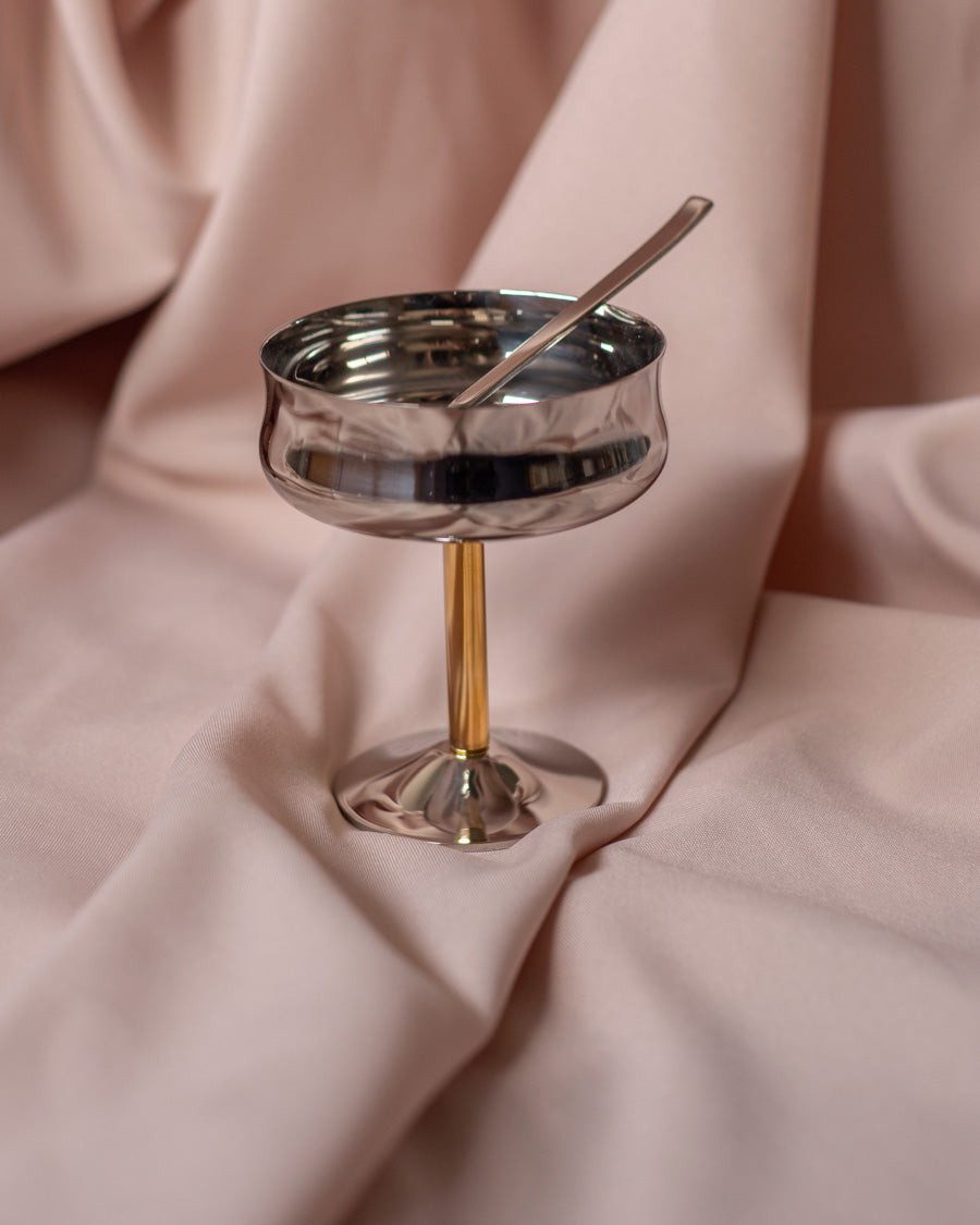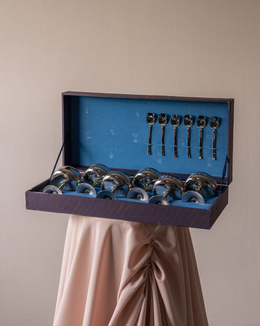 Vintažinės, nerūdijančio plieno ledainės su paauksuotomis kojelėmis ir šaukšteliais. Atkeliavusios iš Italijos, originalioje pakuotėje.