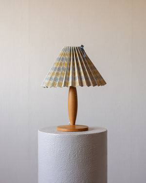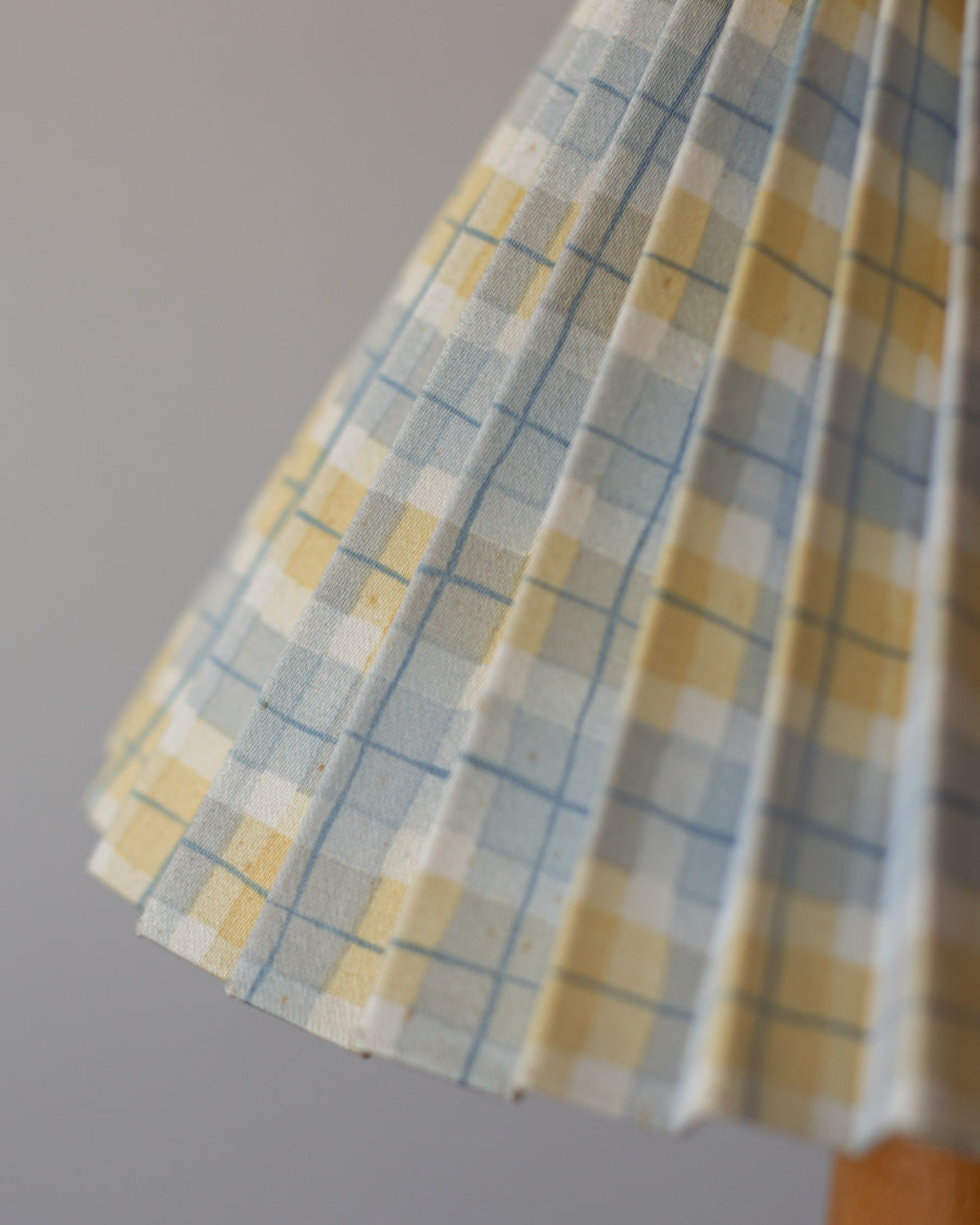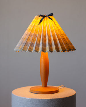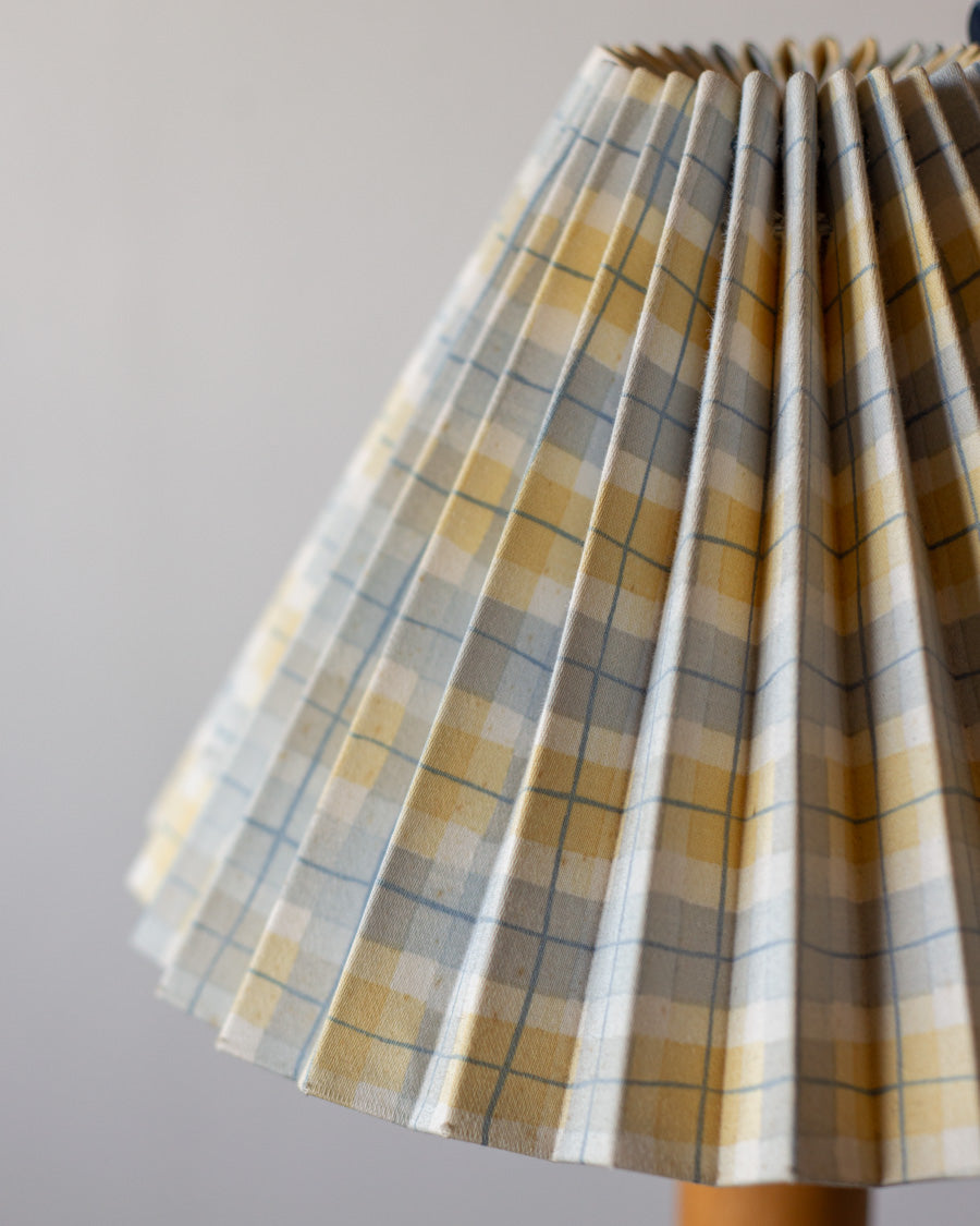 Vintažinis, stalinis šviestuvas su gofruotu gaubtu. Gaubtas yra pagamintas iš languoto - melsva ir gelsva audinio.