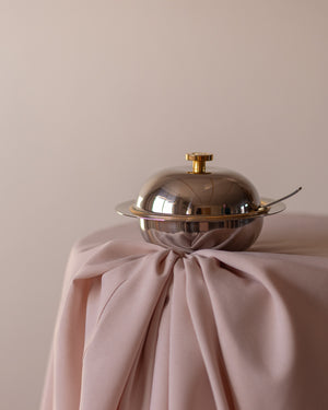Vintažinis, elegantiško dizaino indelis su dangteliu ir paauksuotų linijų dekoru.