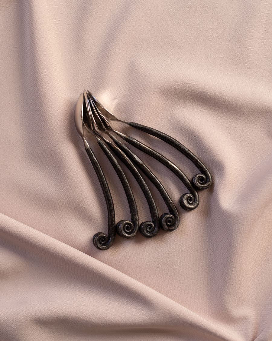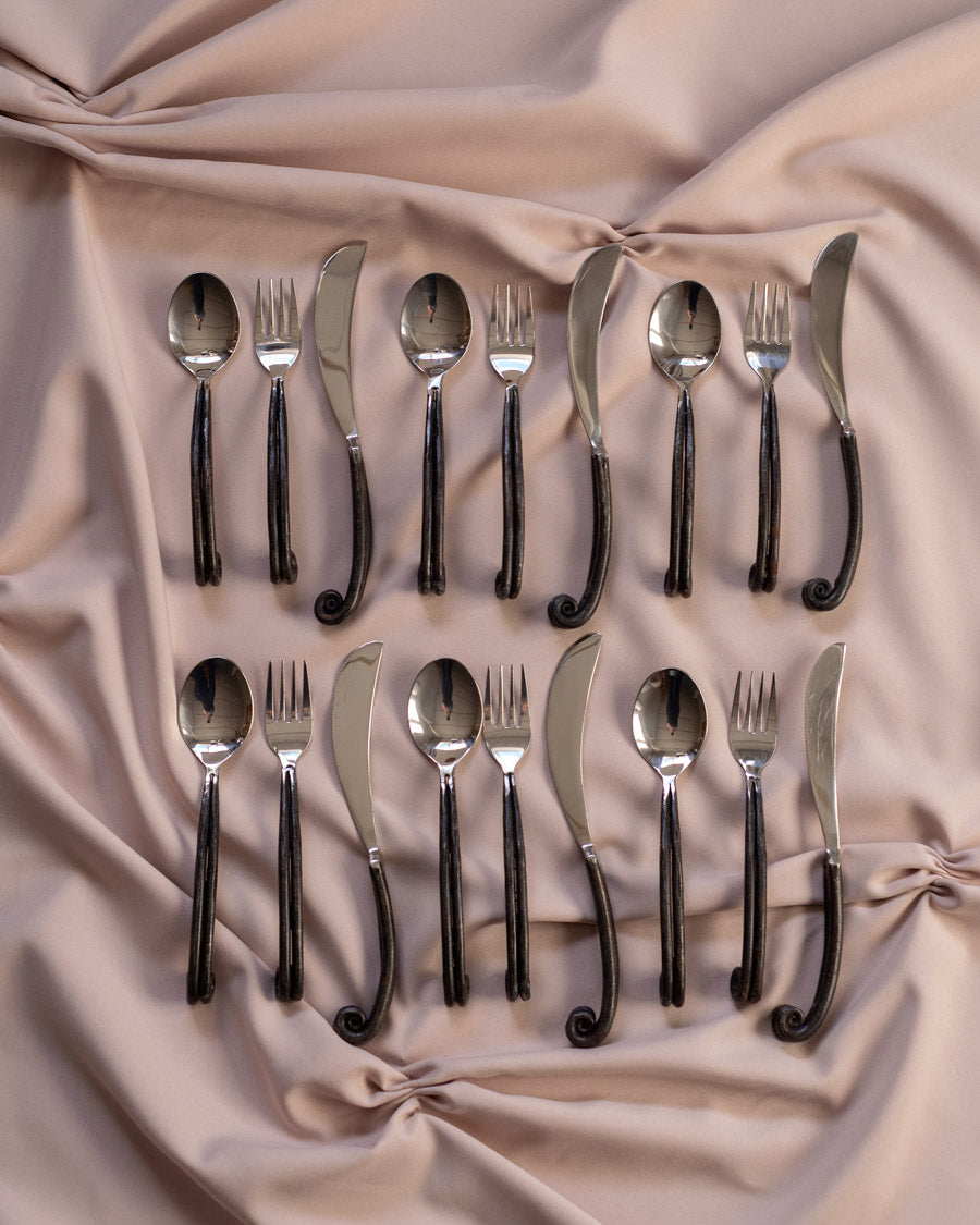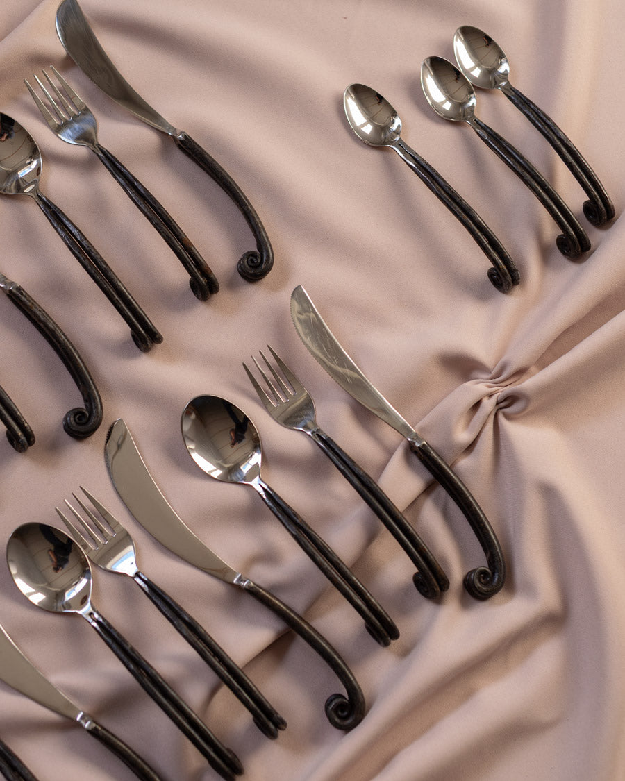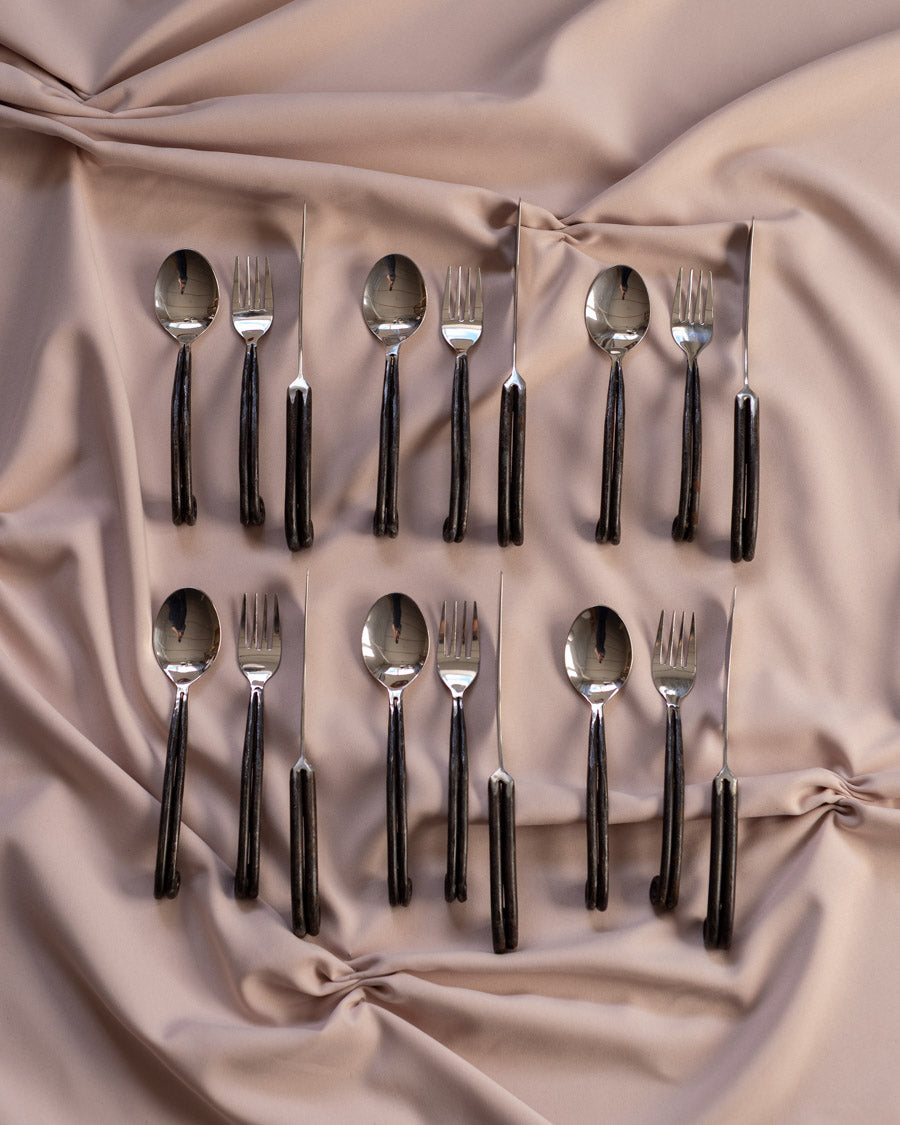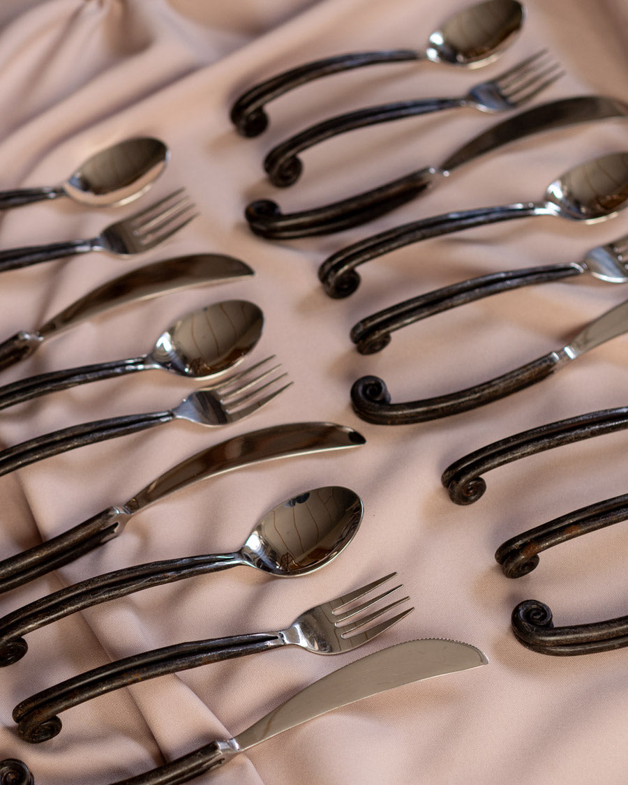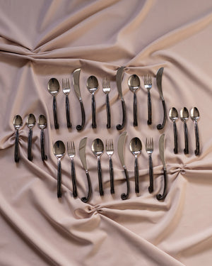 Išskirtinio dizaino, rankų darbo įrankiai - 6 šaukštai, 6 šakutės, 6 peiliai ir 6 šaukšteliai su juodomis, kalinėtomis rankenomis.