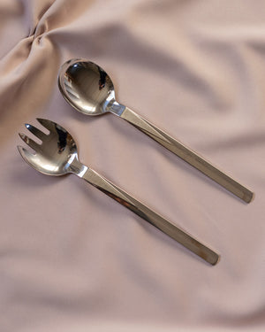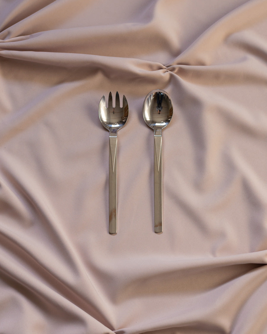 Minimalistinio dizaino serviravimo įrankiai pagaminti iš šlifuoto ir poliruoto nerūdijančio plieno.