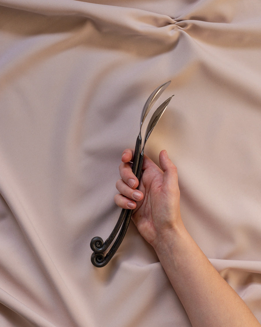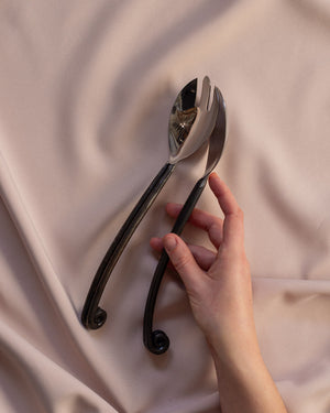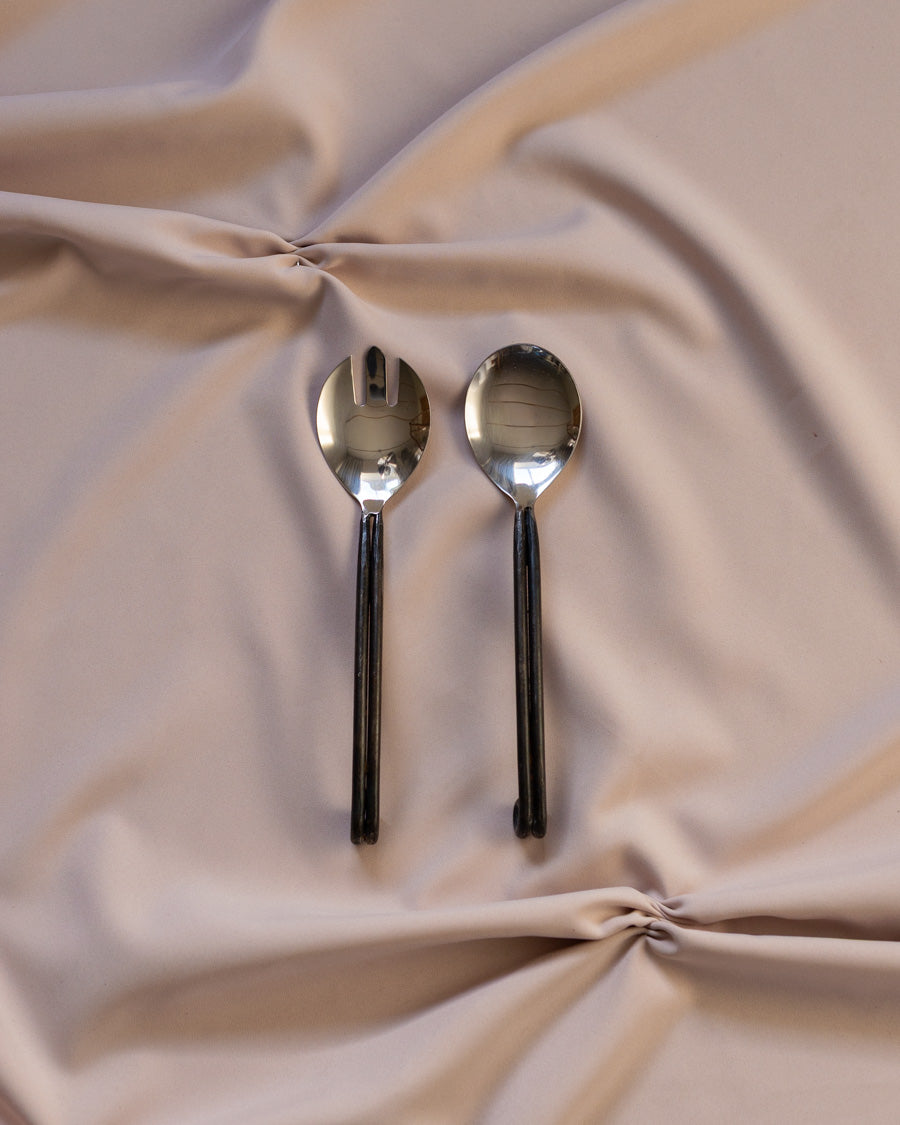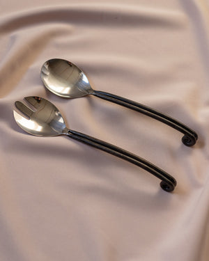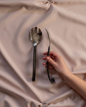 Išskirtinio dizaino, rankų darbo serviravimo įrankiai su juodomis, kalinėtomis rankenomis.