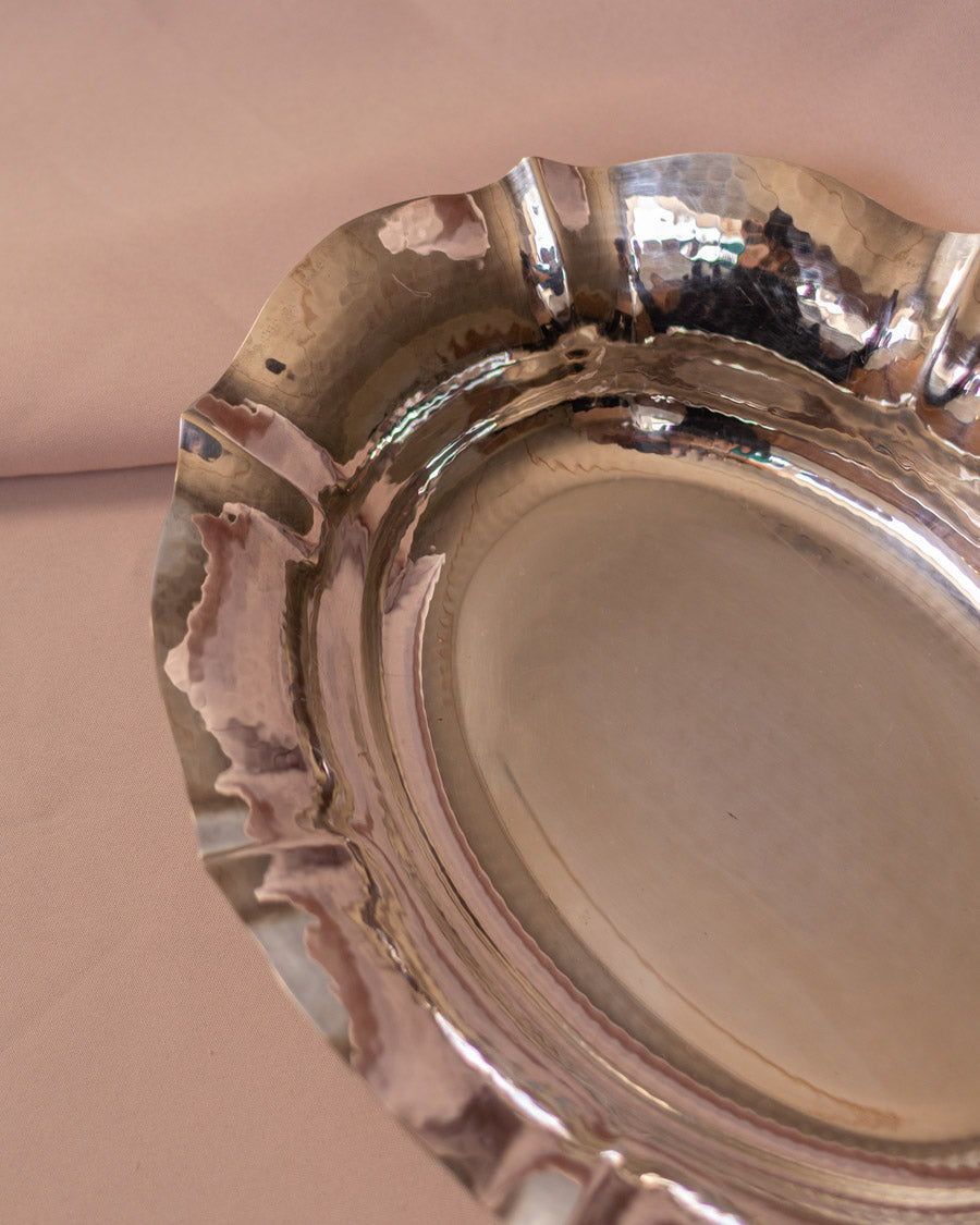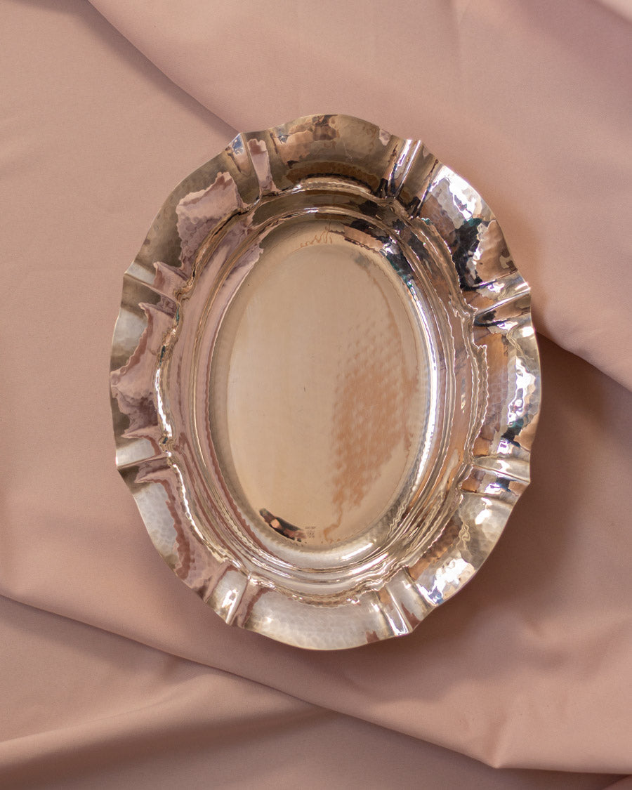 Vintažinis, ovalo formos, sidabru dengtas kalinėtas dubuo, atkeliavęs iš Italijos.
