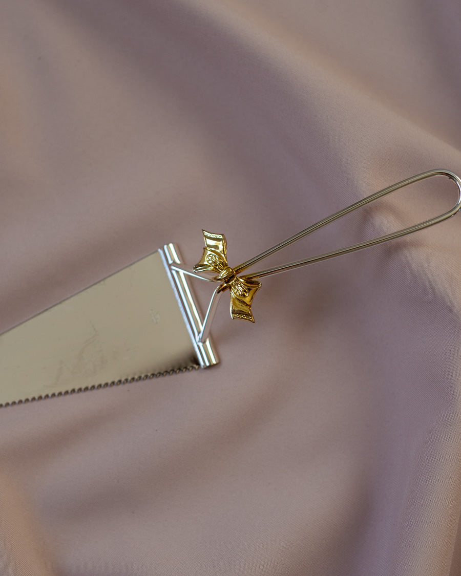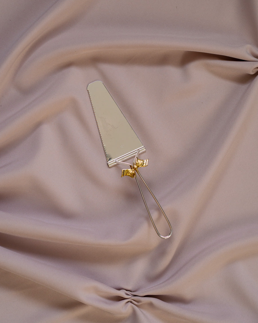 Vintažinė, sidabru dengta torto mentelė, dekoruota mielu, paauksuotu kaspinėliu.