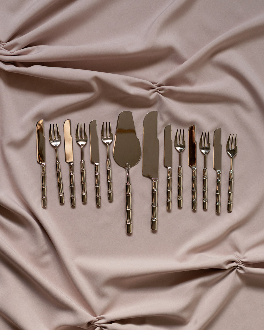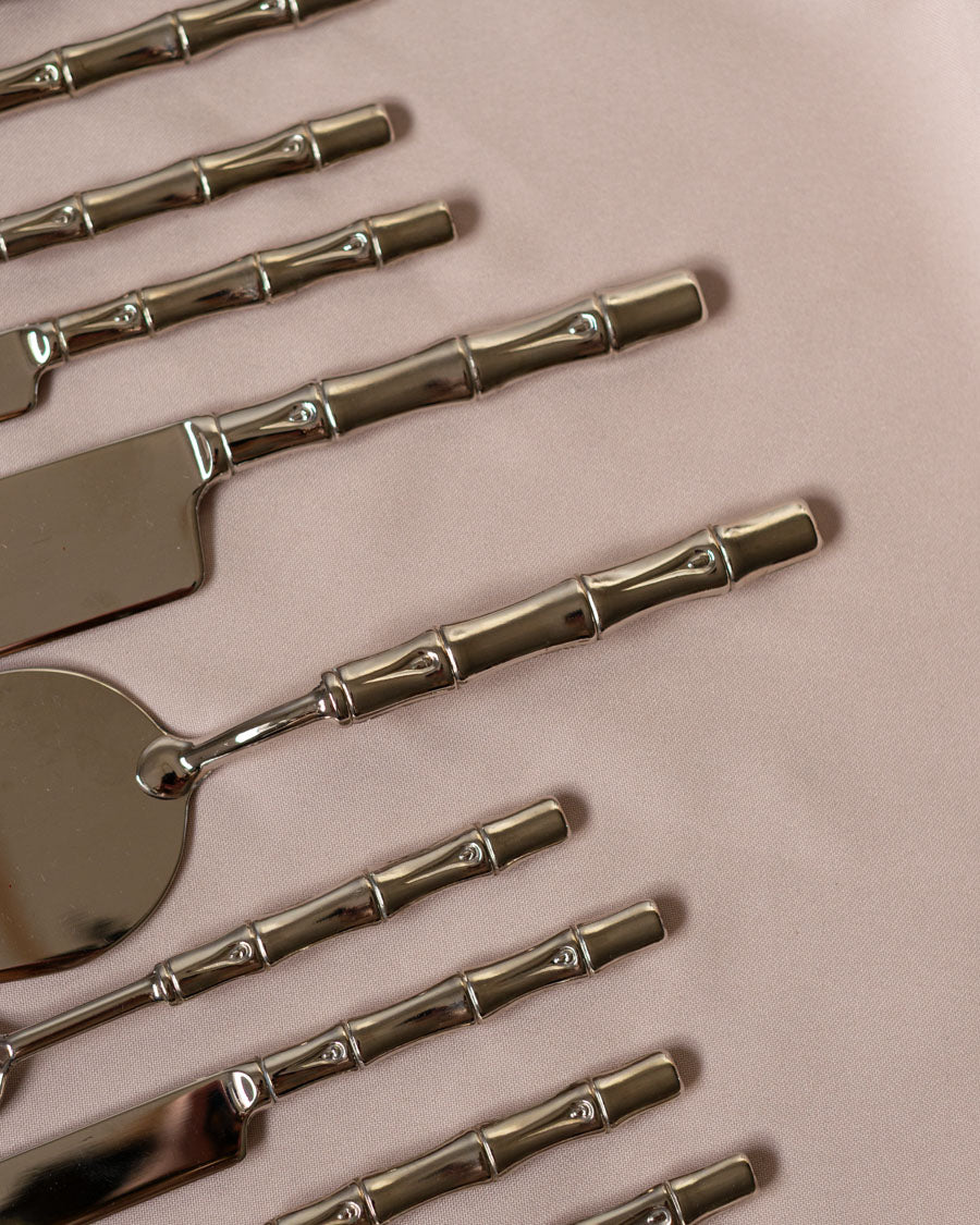 Vintažiniai, puošnūs sidabru dengti desertų įrankiai - šakutės ir šaukšteliai, torto mentelė ir peilis.