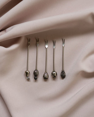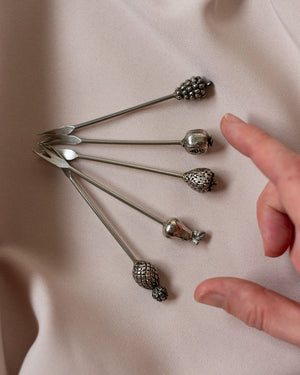 5 skirtingų dizainų, sidabru dengti užkandžių smeigtukai, su vaisių dekoru.
