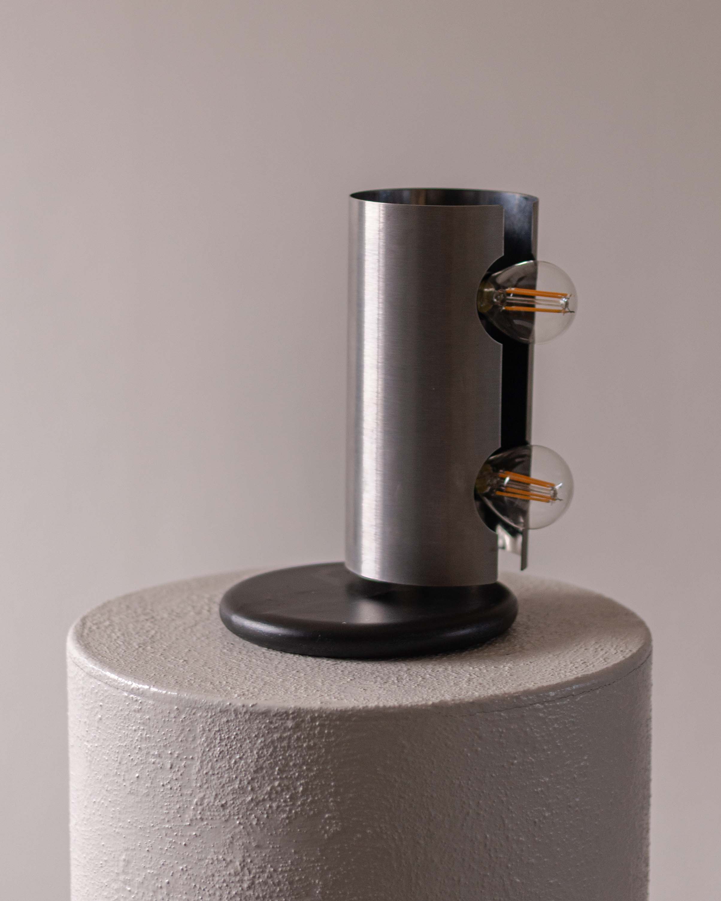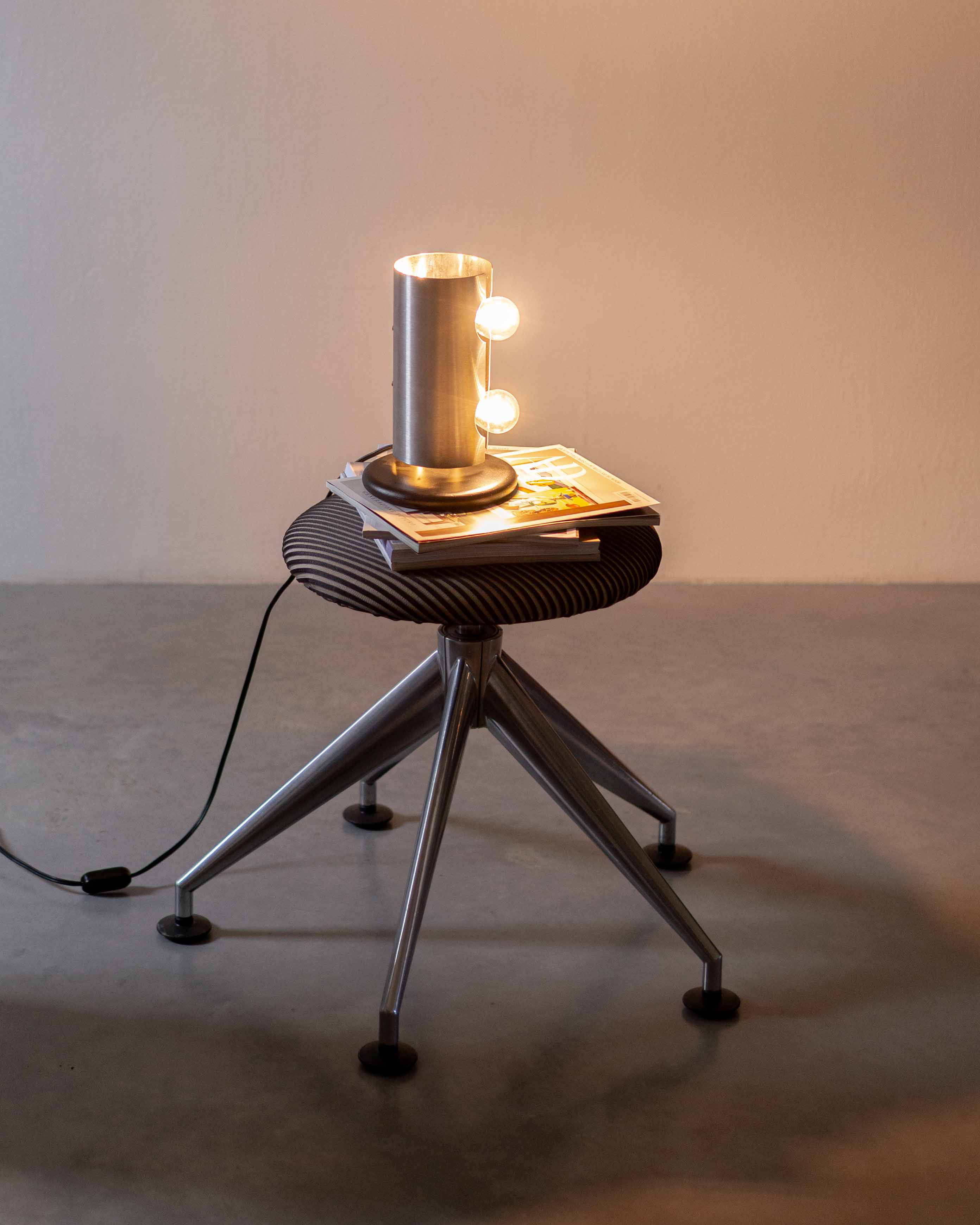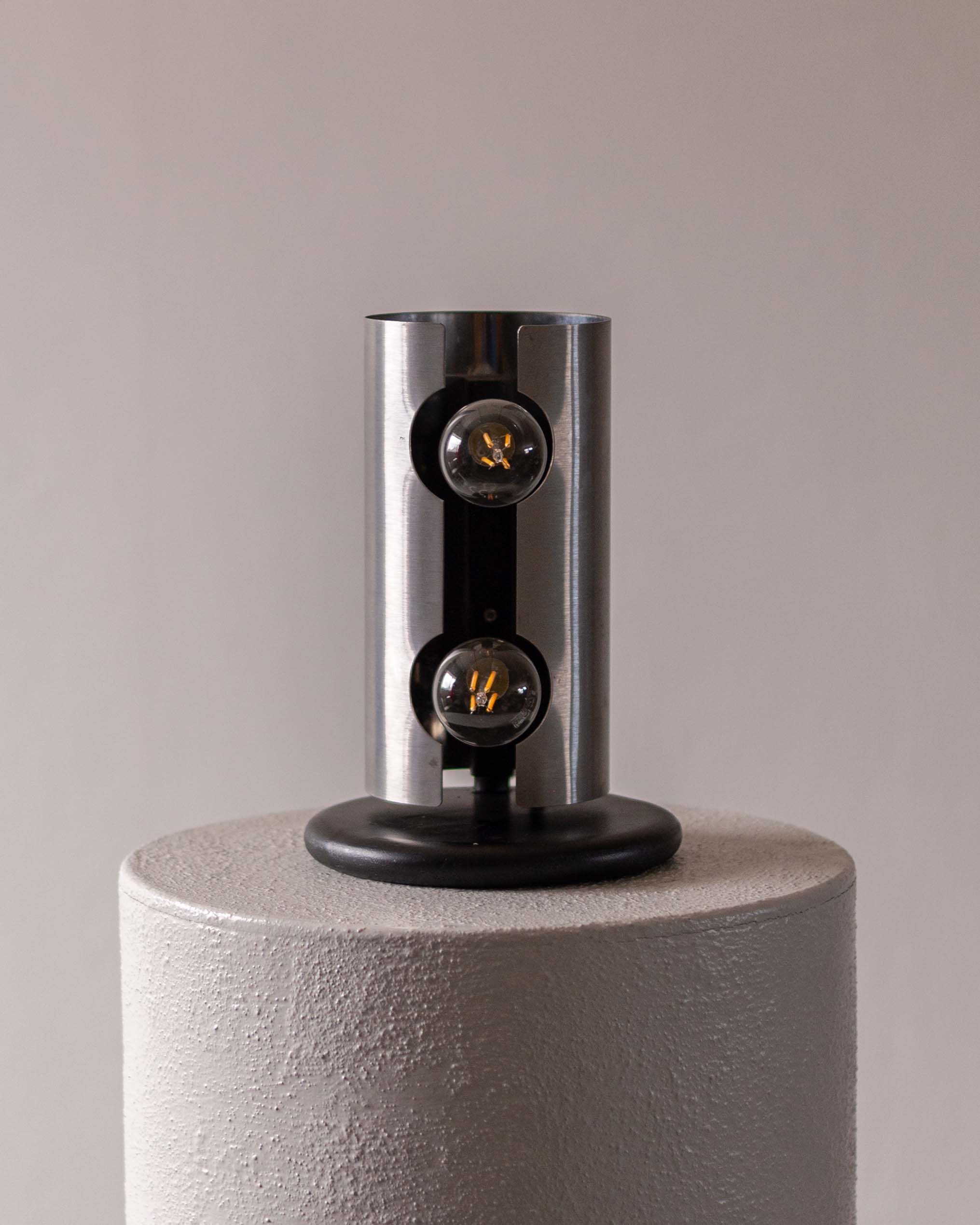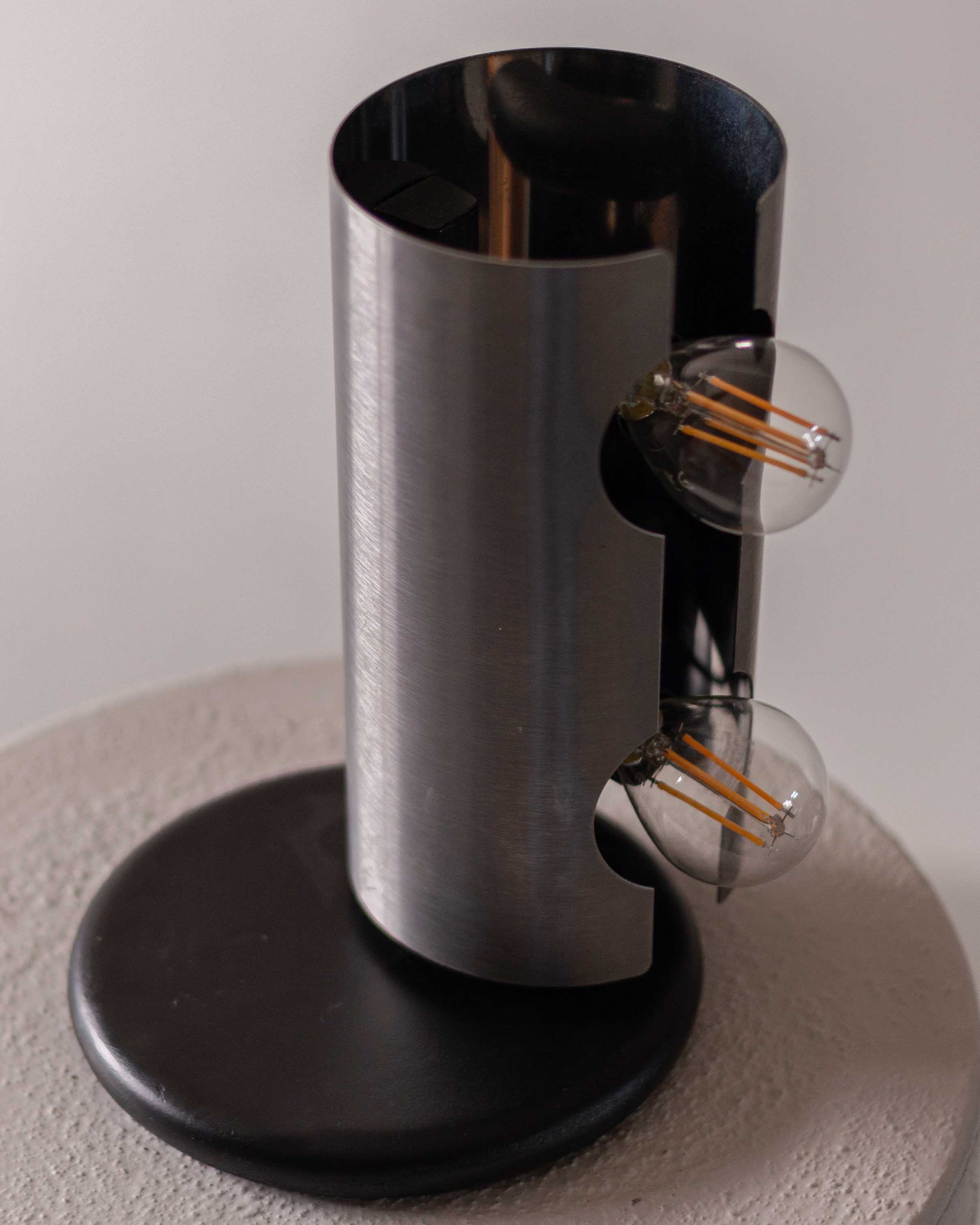 Vintažinis, Space Age stiliaus abat-jour, šlifuoto plieno šviestuvas su juodo metalo pagrindu.