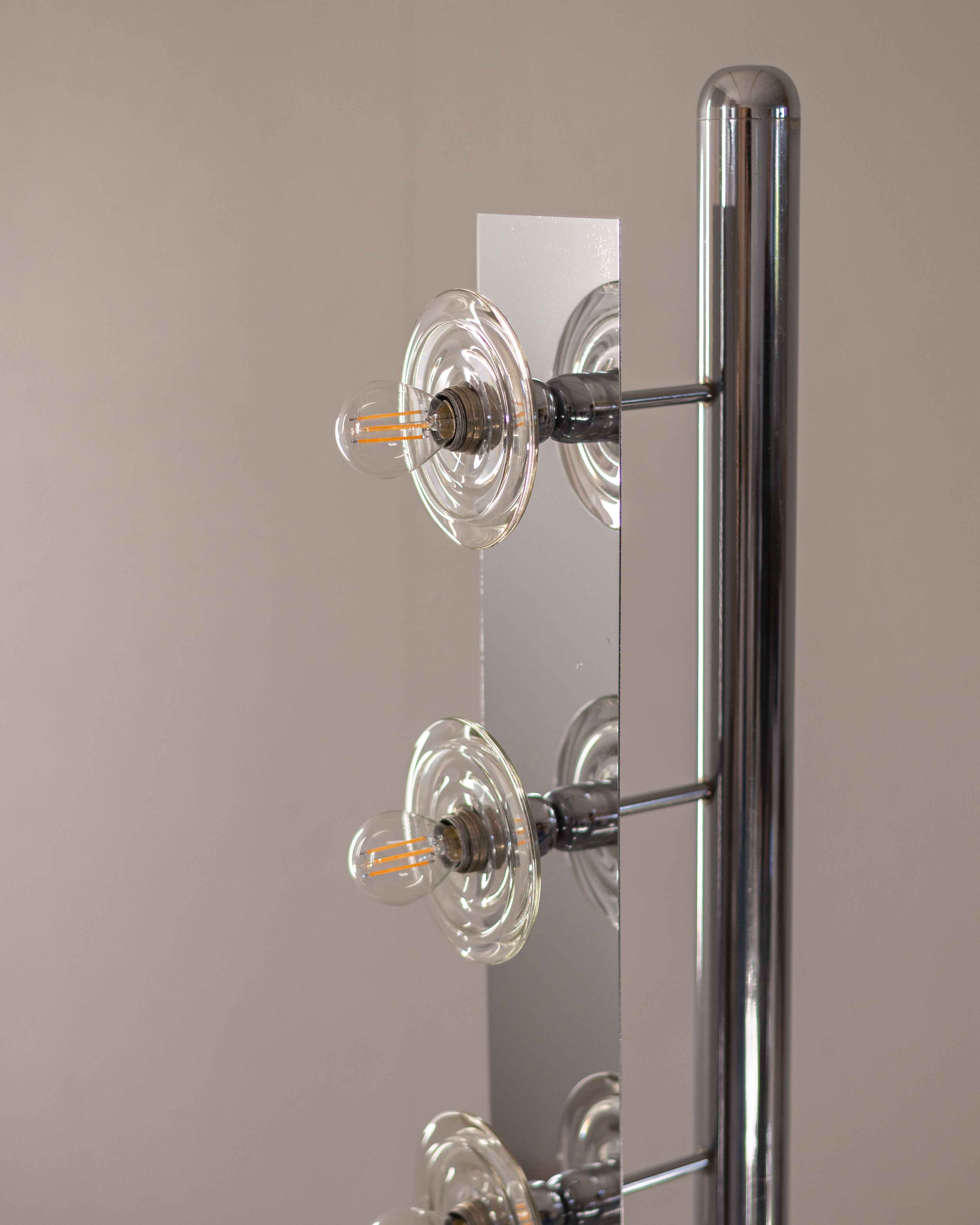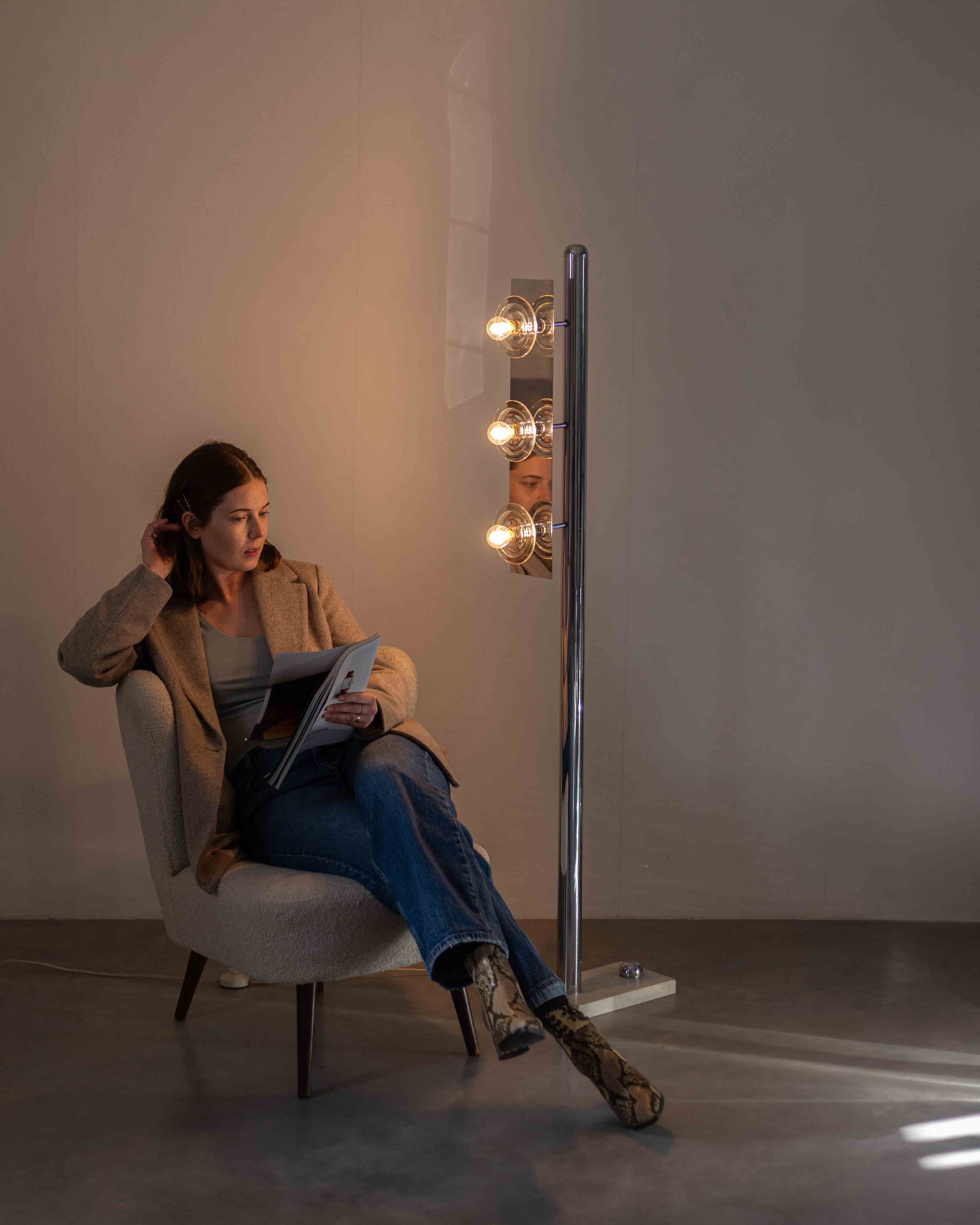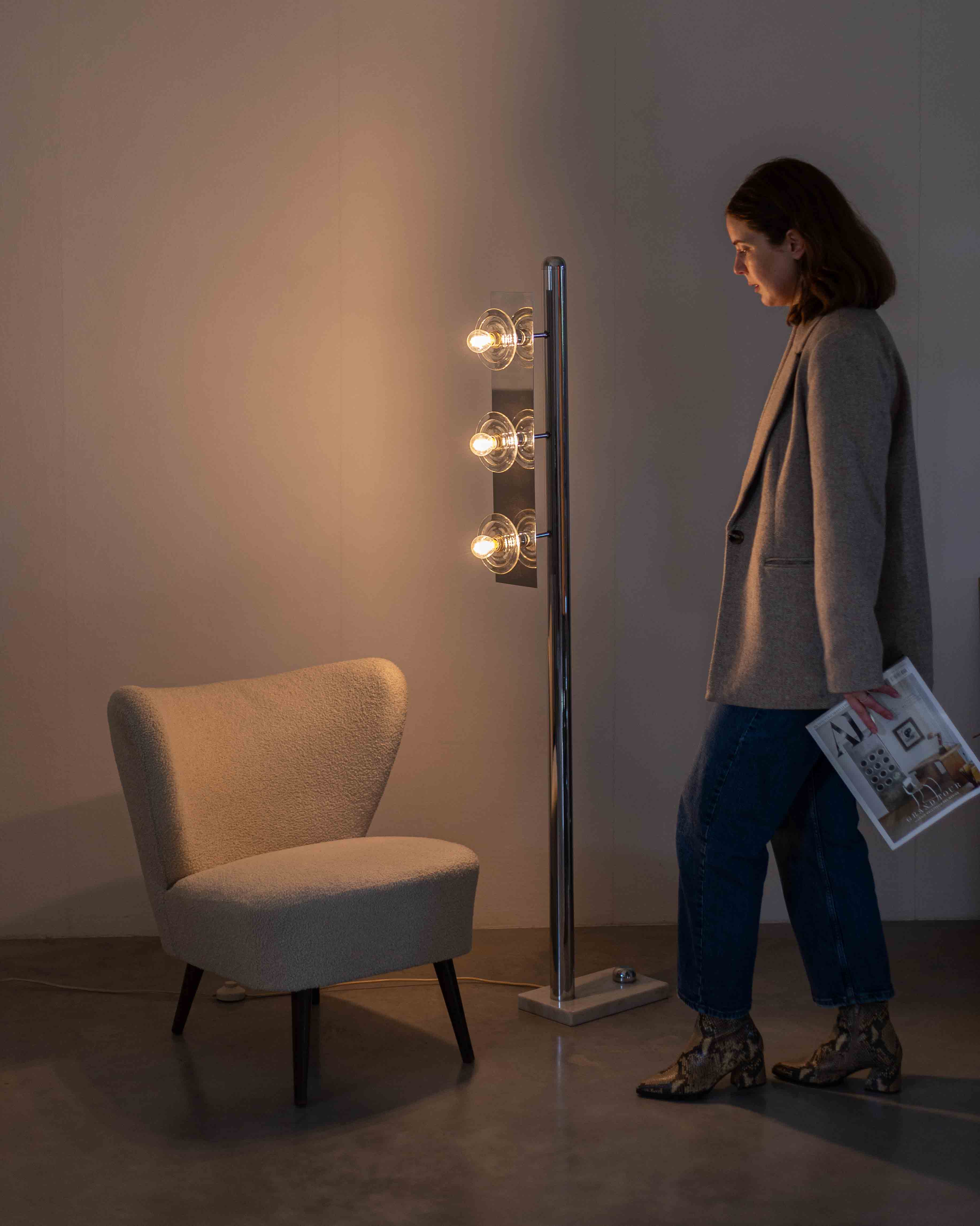 Chromo karkaso toršeras su skaidraus murano stiklo detalėmis ir marmuro pagrindu, vieniems jis primena kosmoso šviesaforą, kitiems – sieninį bra šviestuvą.