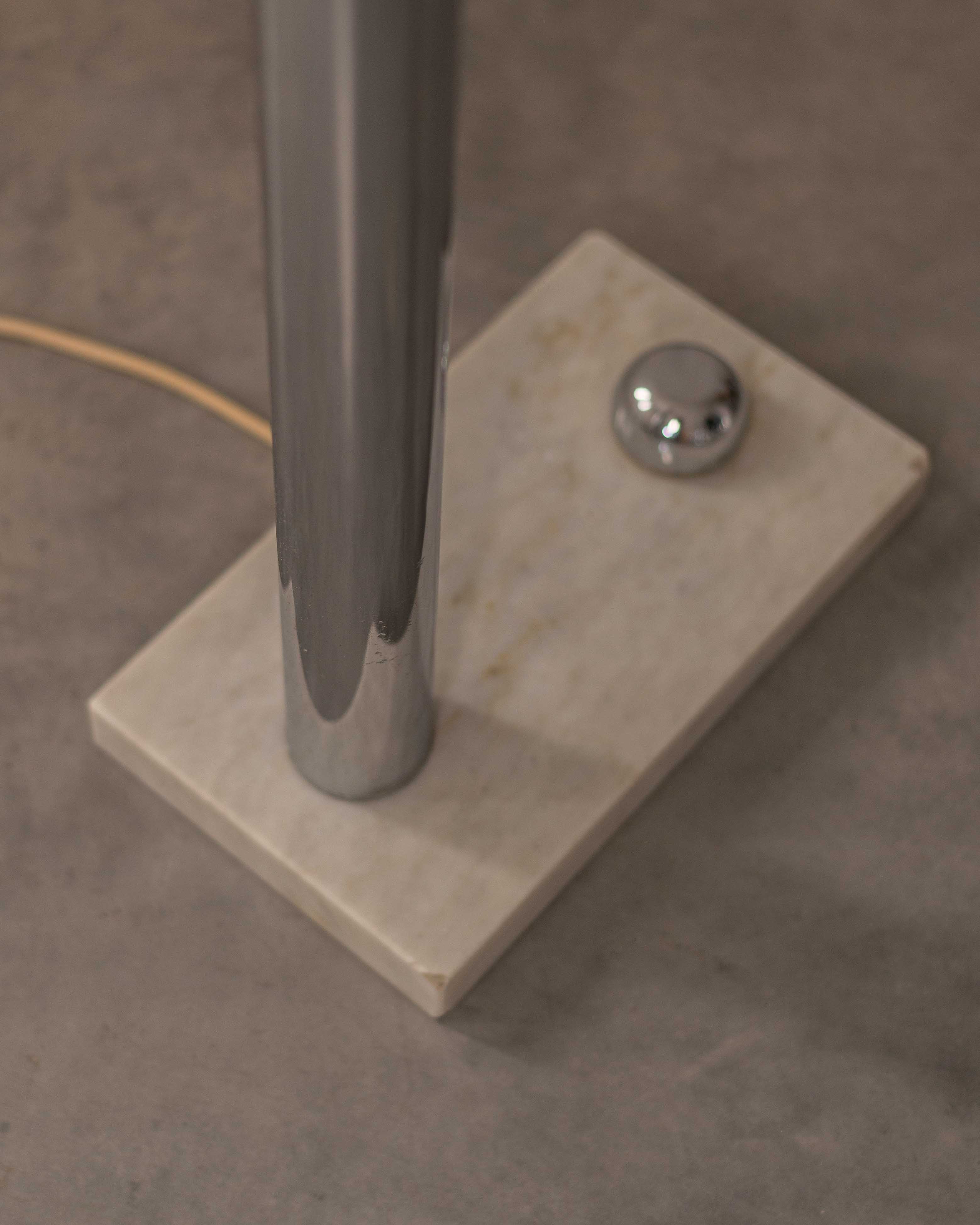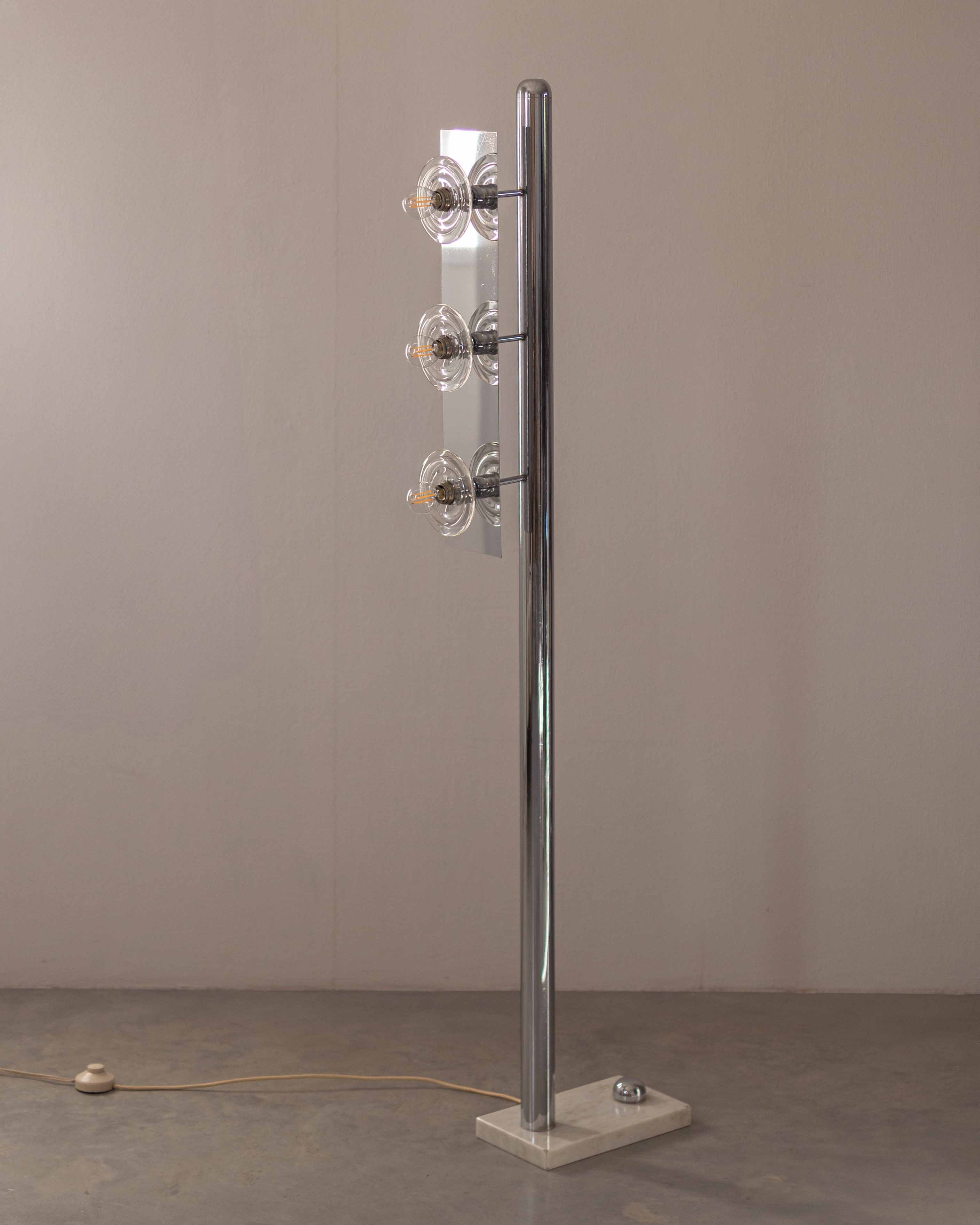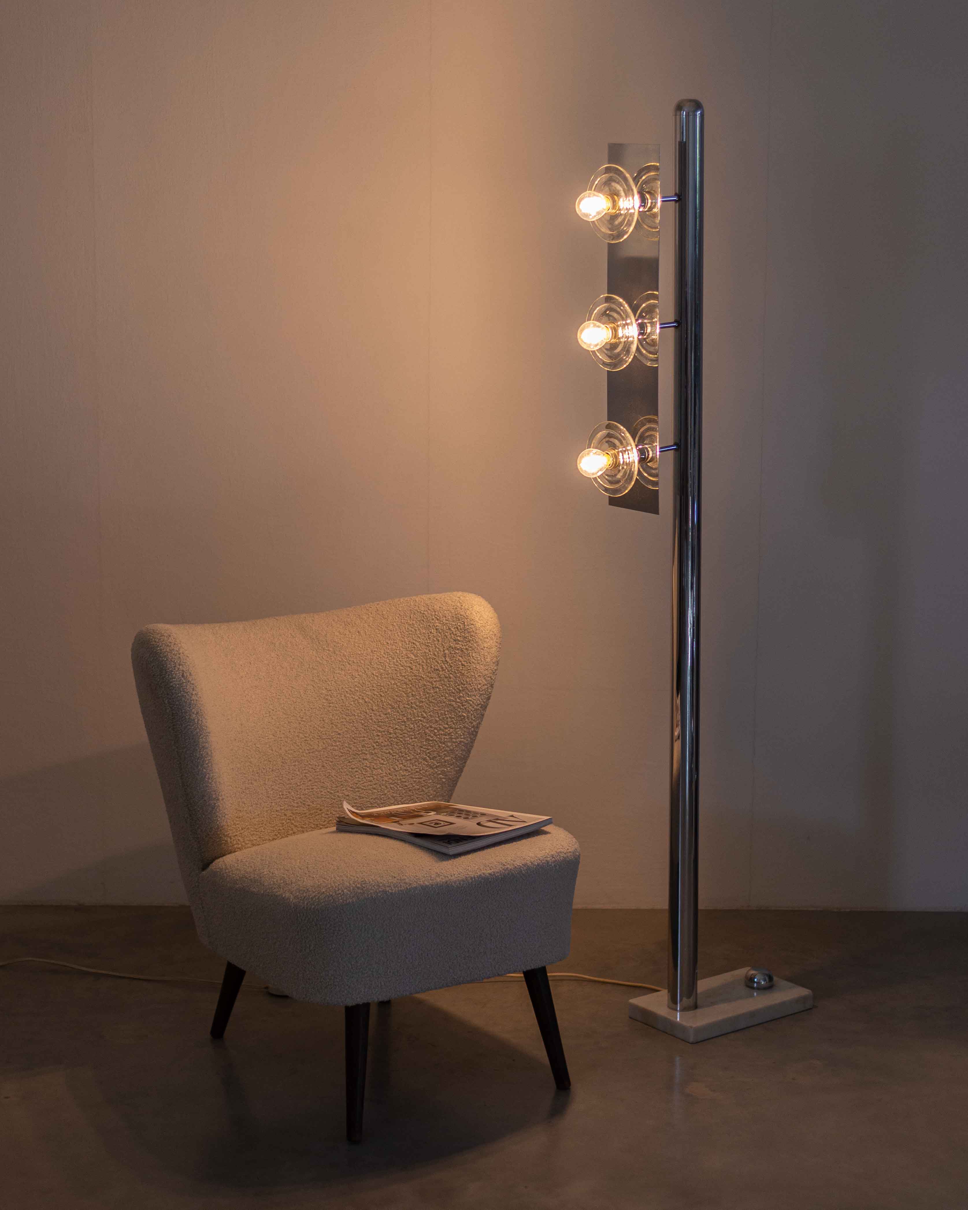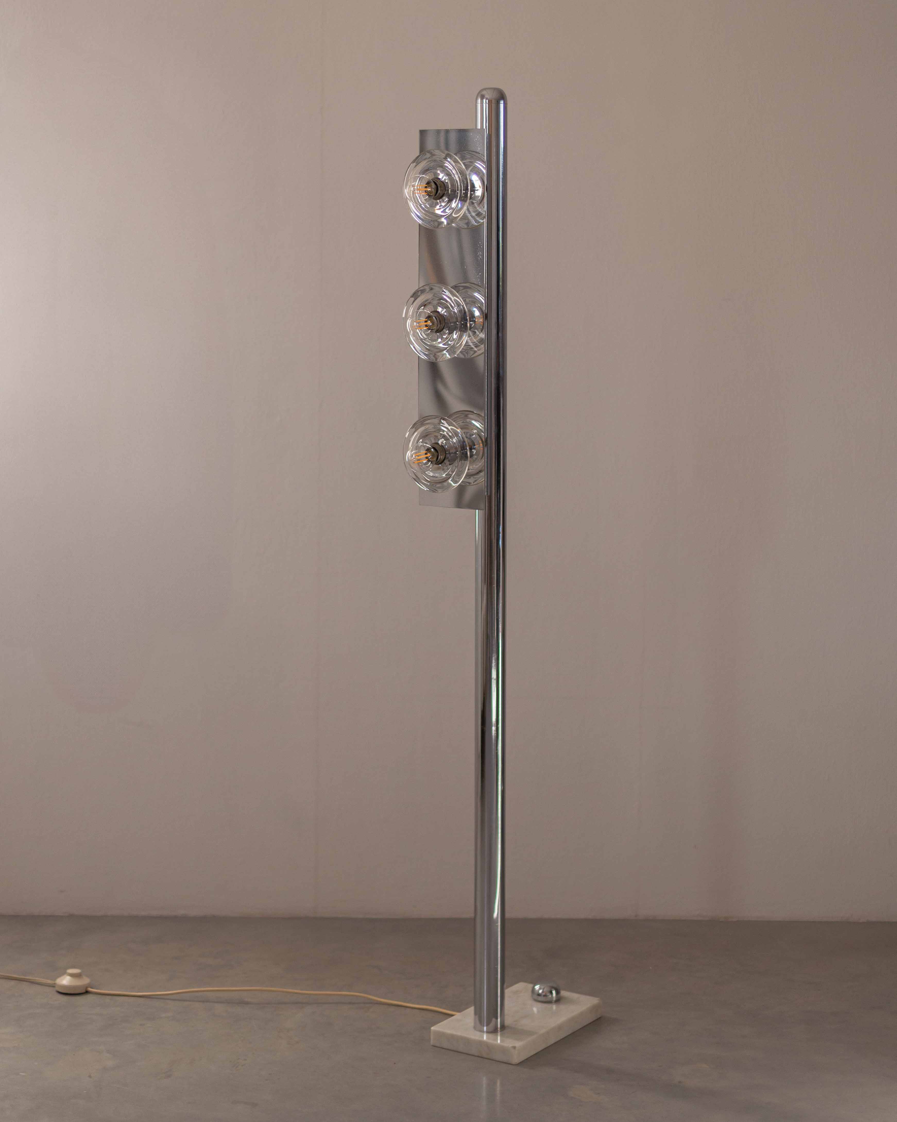 Chromo karkaso toršeras su skaidraus murano stiklo detalėmis ir marmuro pagrindu, vieniems jis primena kosmoso šviesaforą, kitiems – sieninį bra šviestuvą.