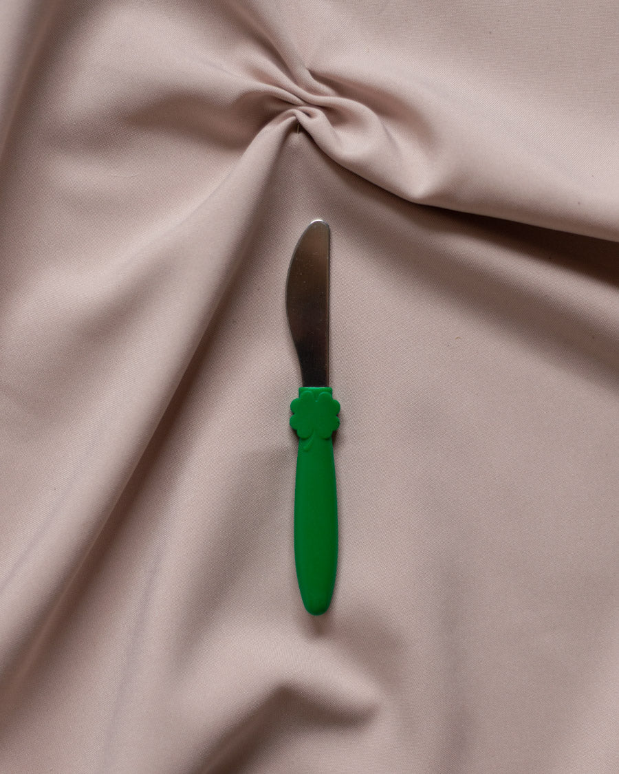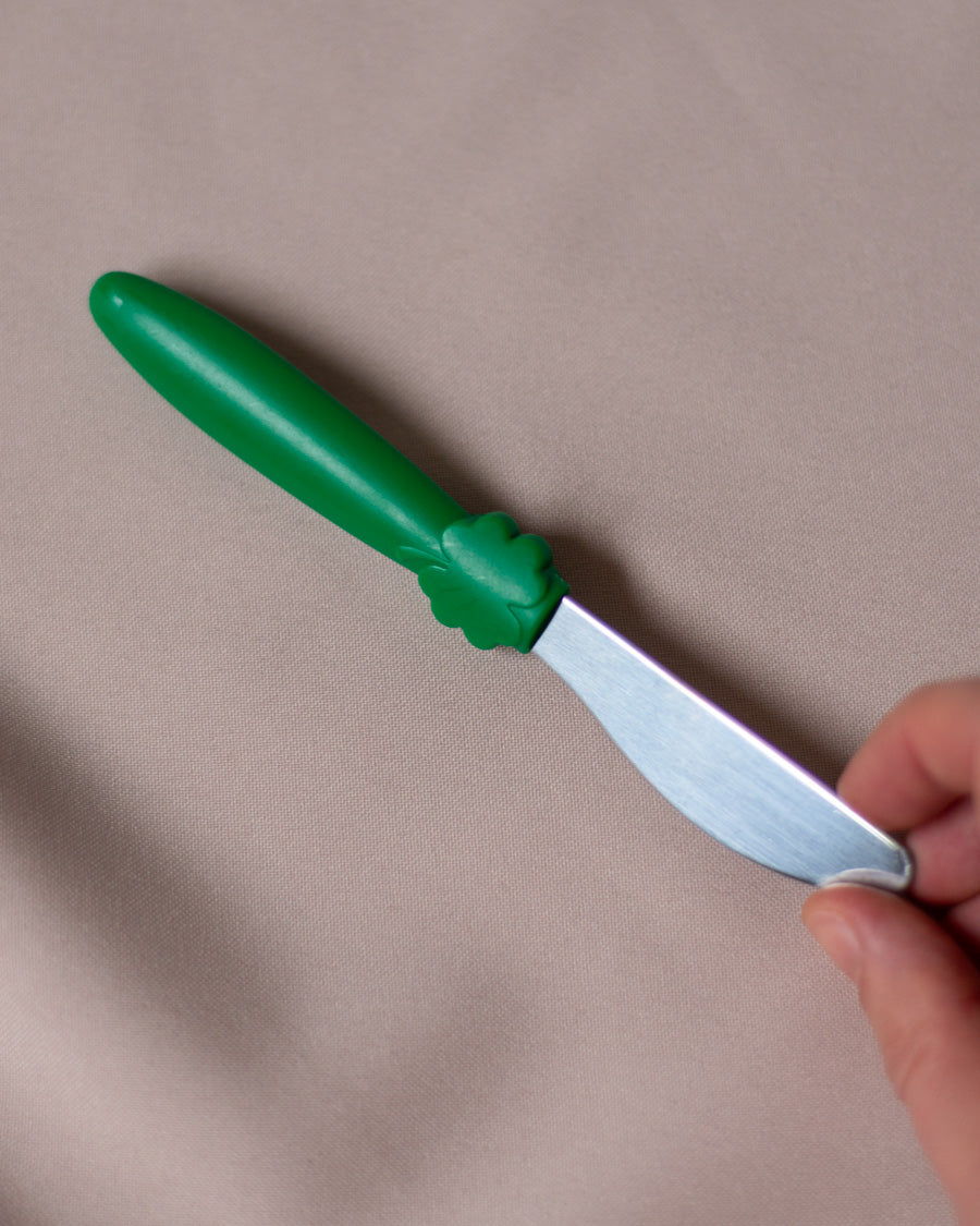 Dekoratyvaus dizaino sviesto peiliukas su dobilo lapeliu.