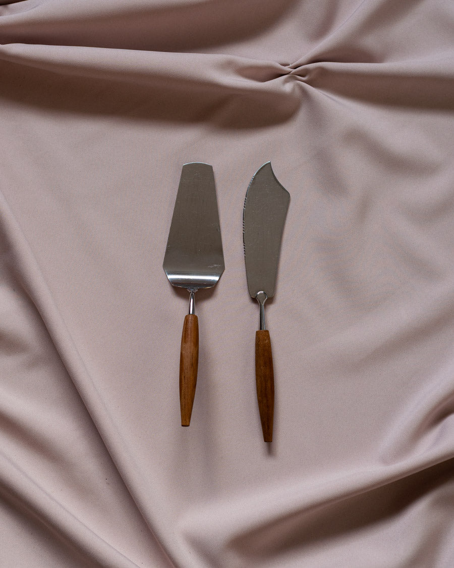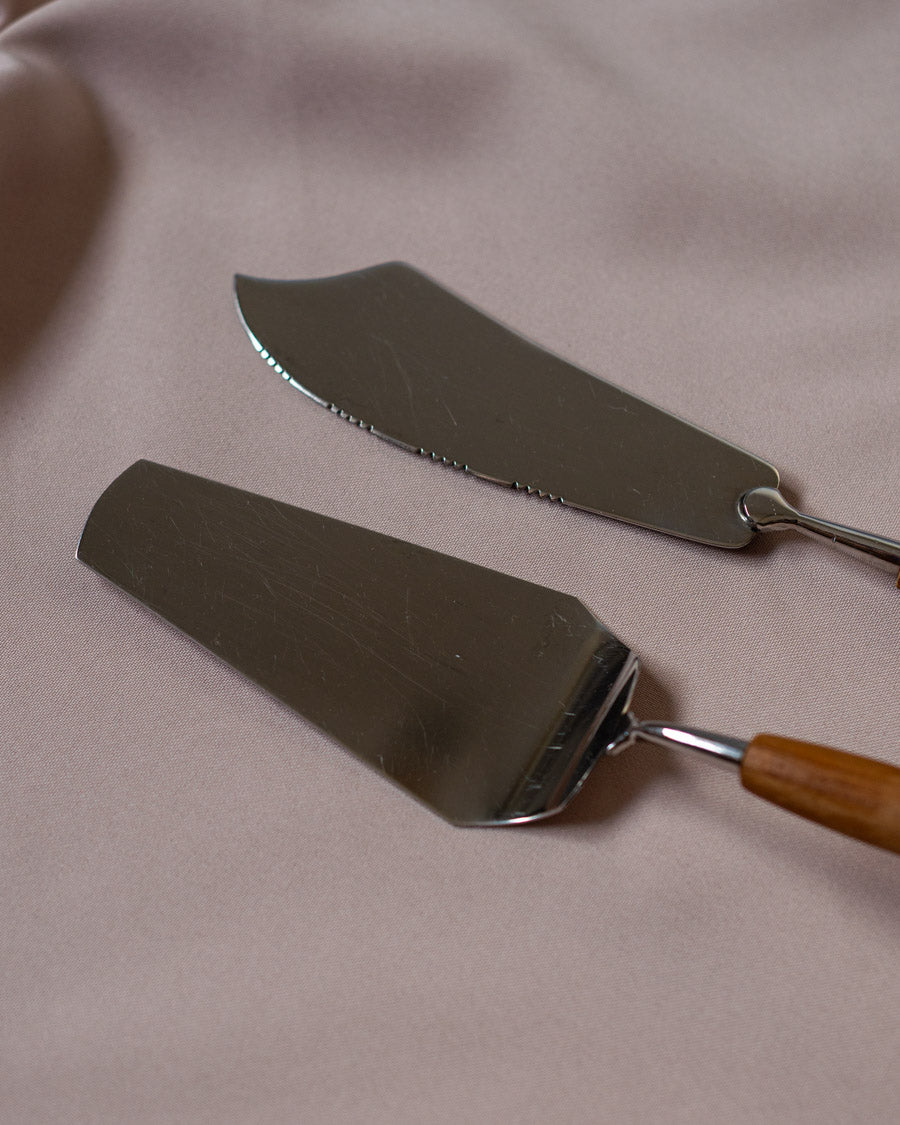 Vintažiniai torto įrankiai su medinėmis rankenomis.