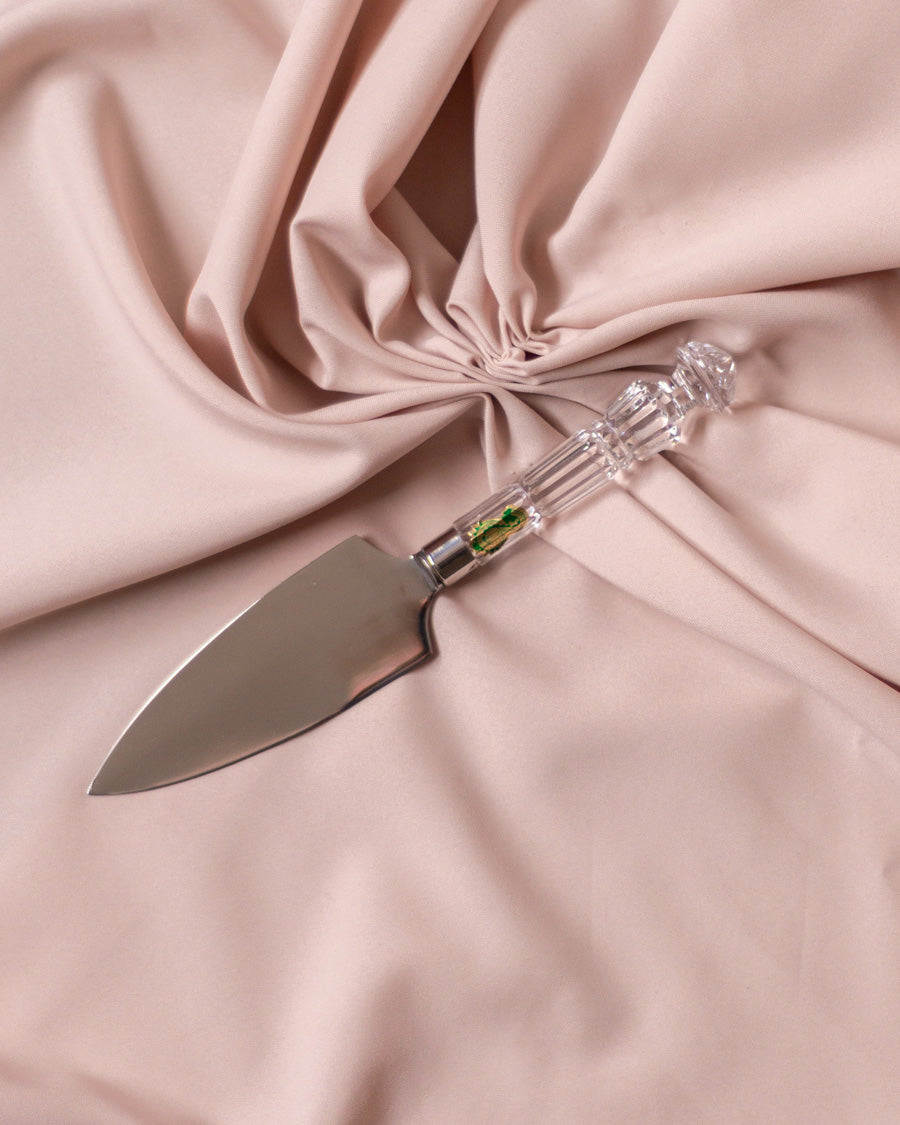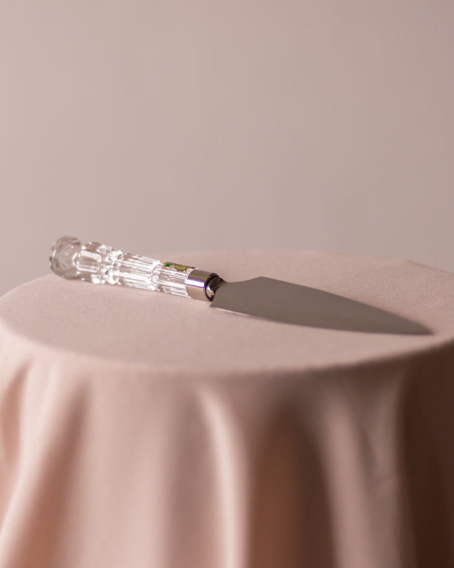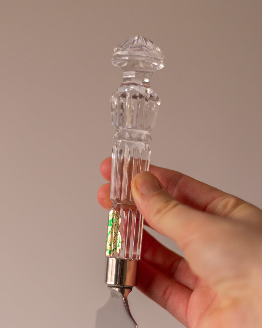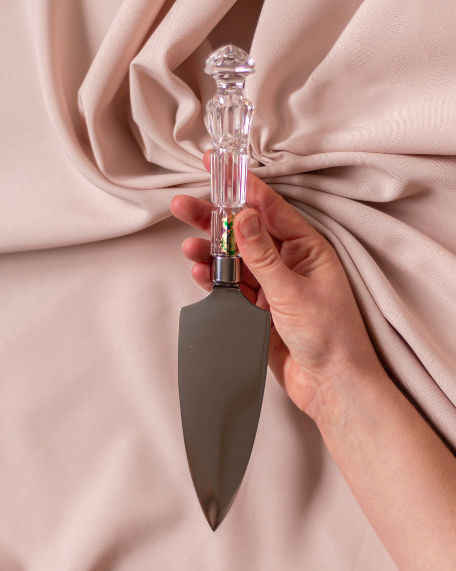 Vintažinė, nerūdijančio plieno torto mentelė su dekoratyvia, raižyto stiklo rankenėle.