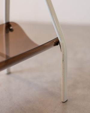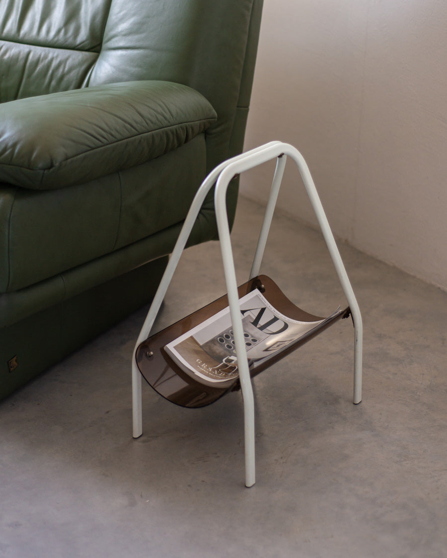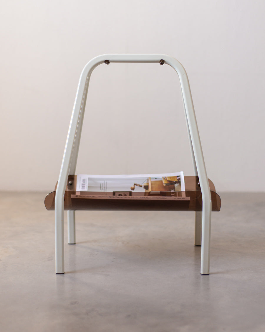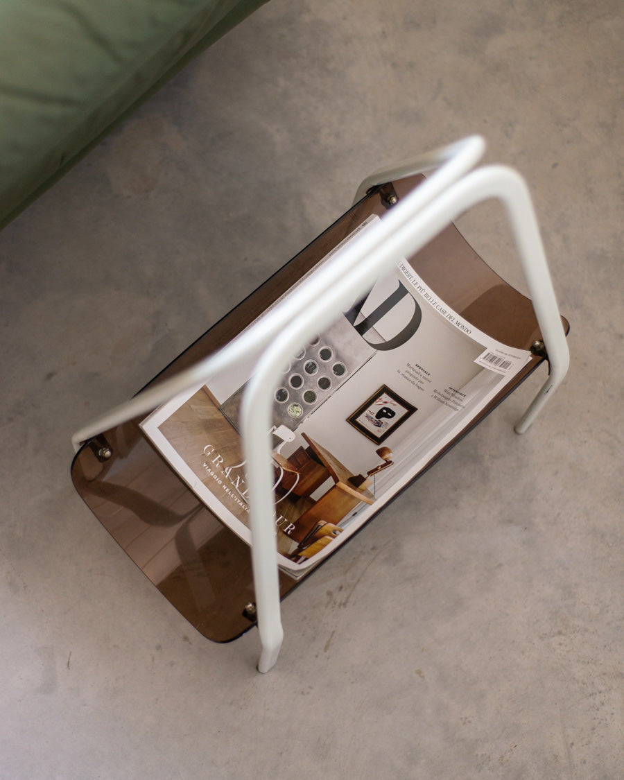 Vintažinė žurnalinė pagaminta iš gintaro spalvos akrilinio stiklo, stovi ant baltų metalinių kojelių.