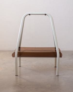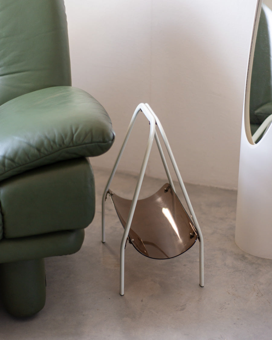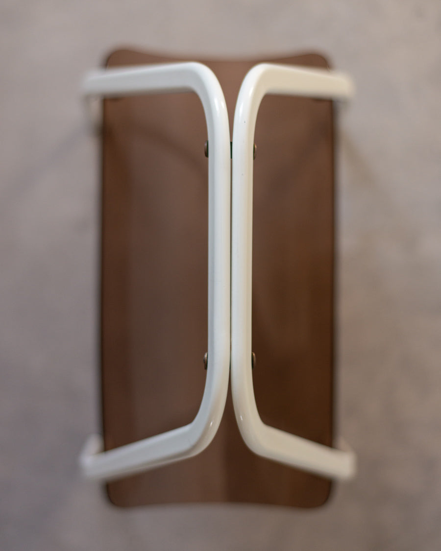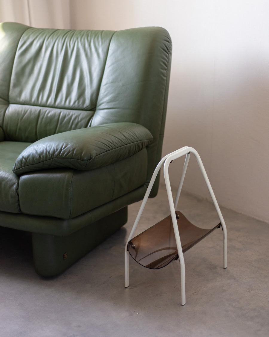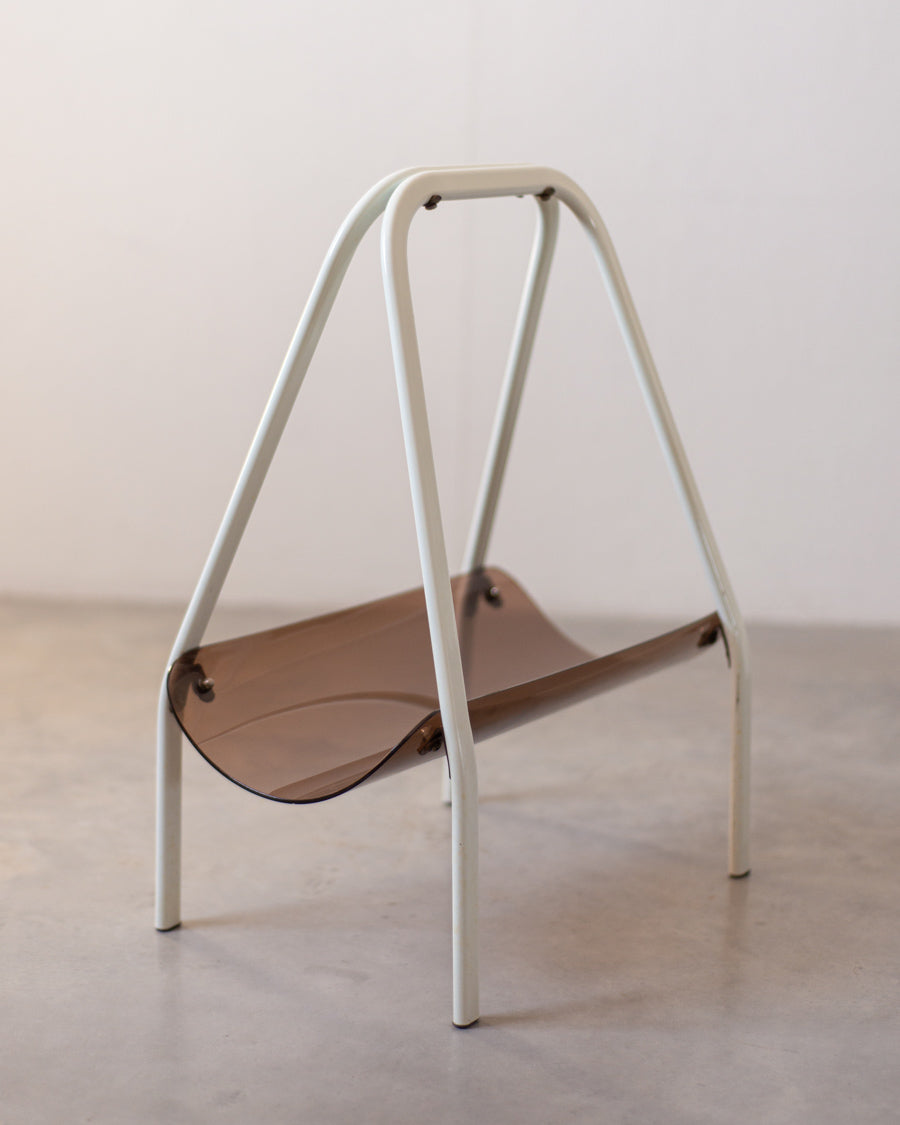 Vintažinė žurnalinė pagaminta iš gintaro spalvos akrilinio stiklo, stovi ant baltų metalinių kojelių.