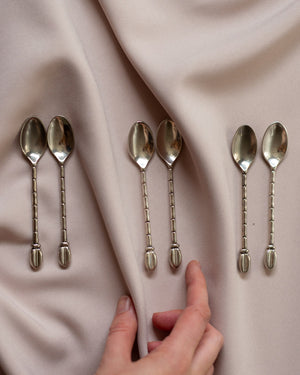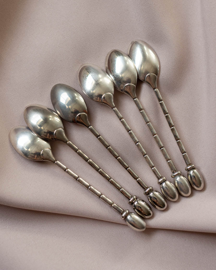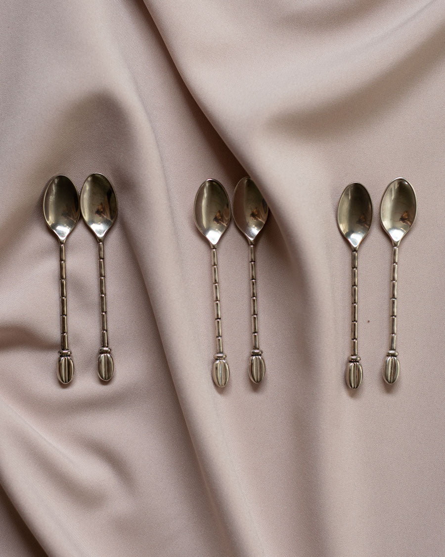 Vintažiniai, sidabru dengti šaukšteliai su kavos pupelių dekoru.