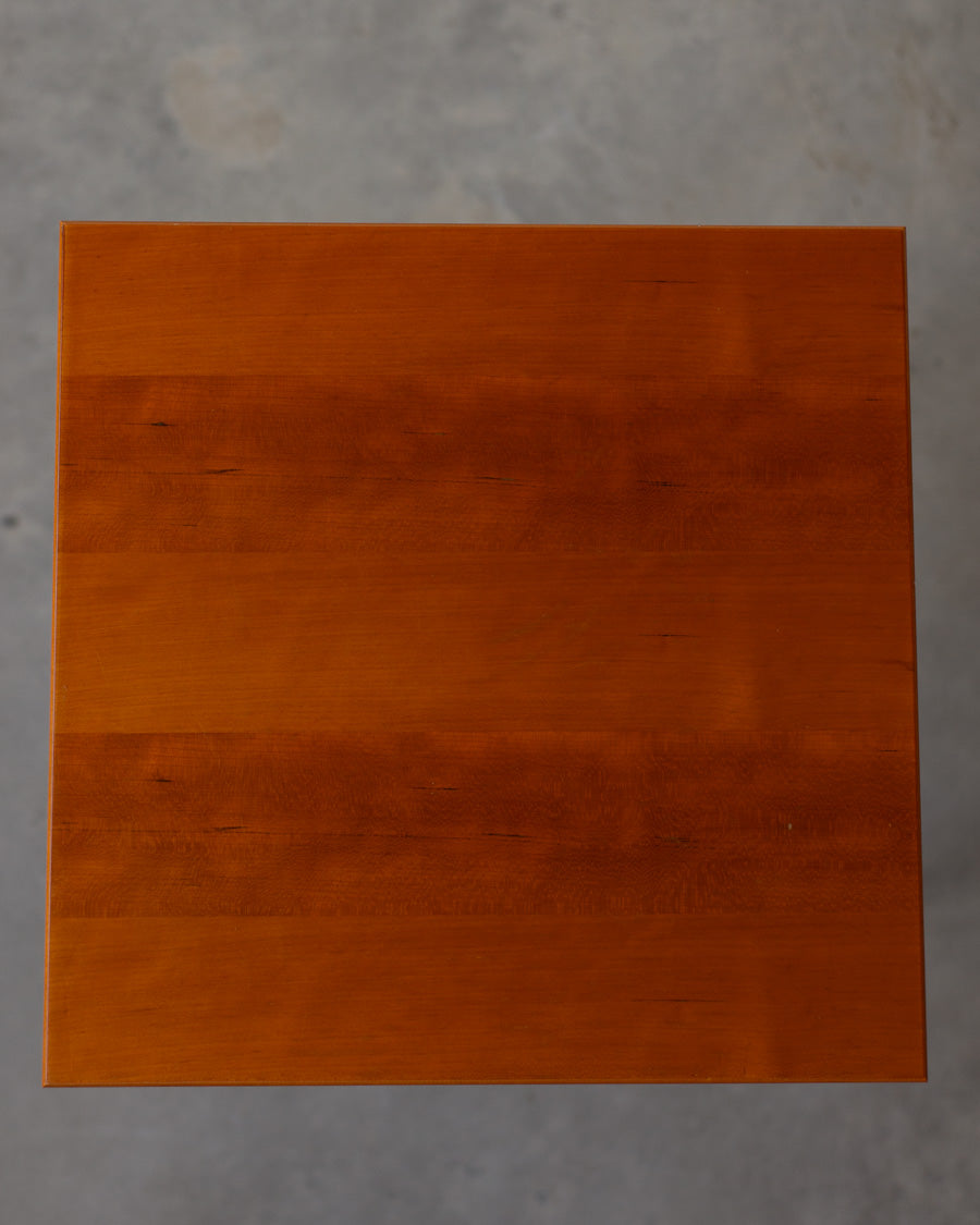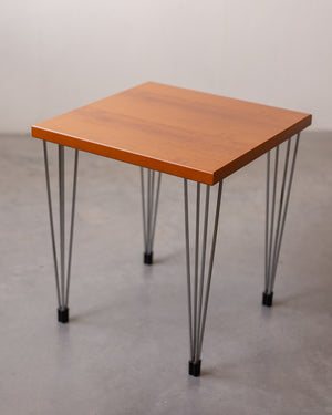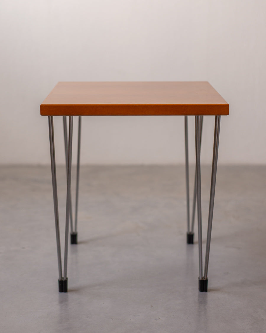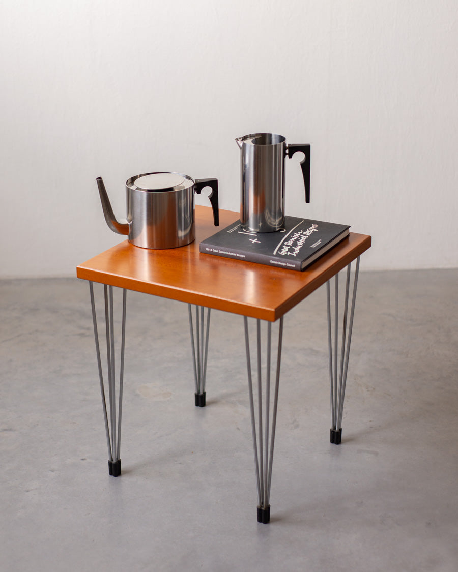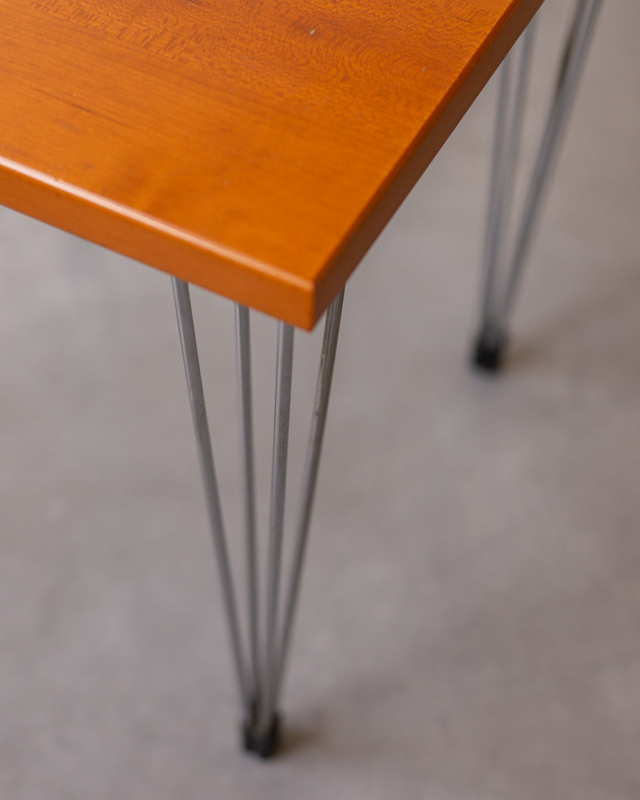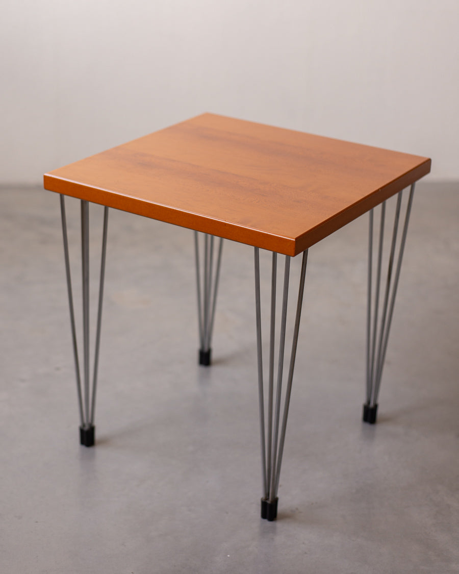 Vintažinis šoninis staliukas su beržo medienos stalviršiu ir chromuotomis metalinėmis kojelėmis.
