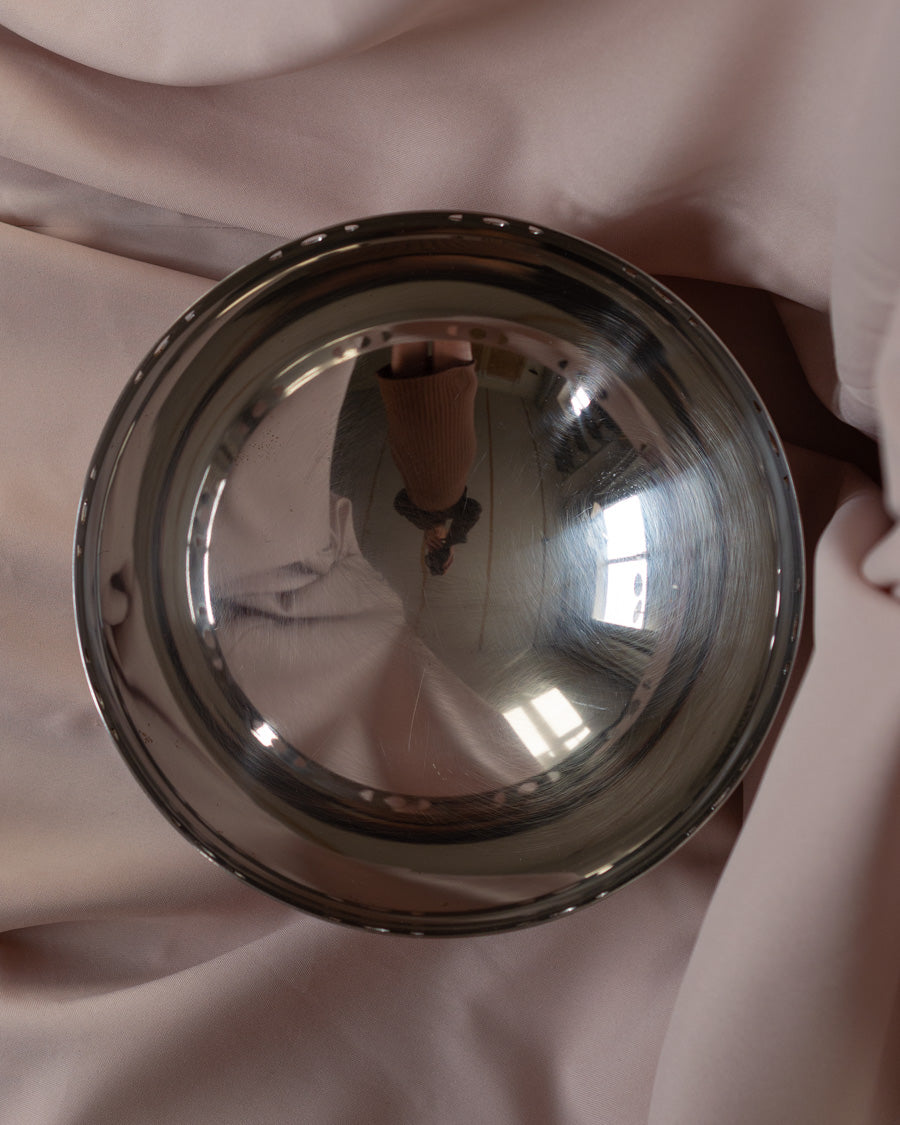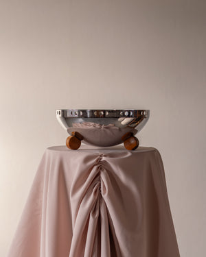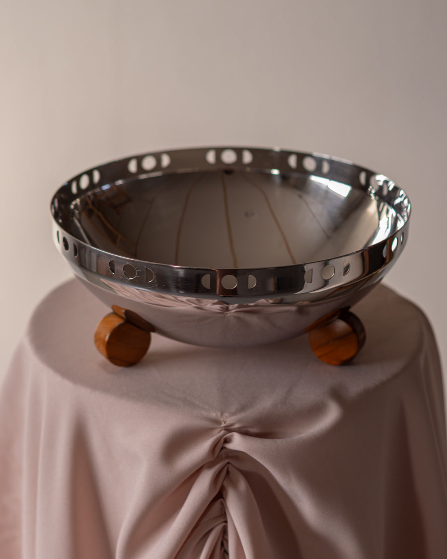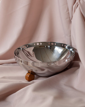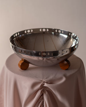 Vintažinis nerūdijančio plieni dubuo su medinėmis, apskritimo formos kojelėmis. Atkeliavęs iš Italijos.