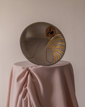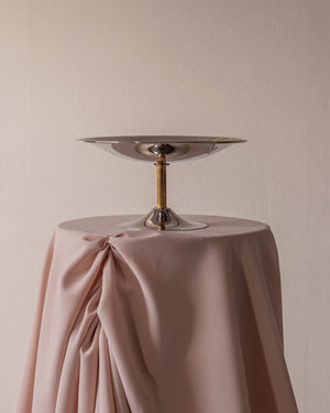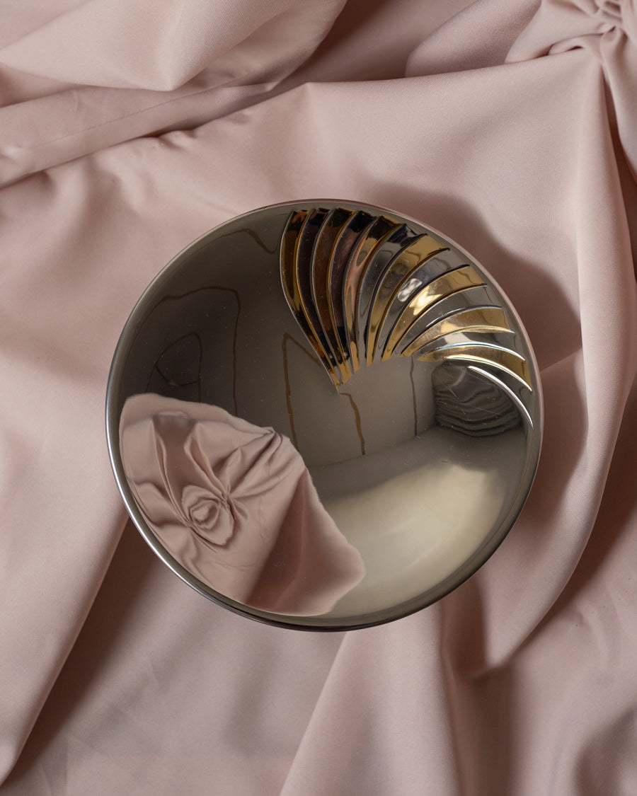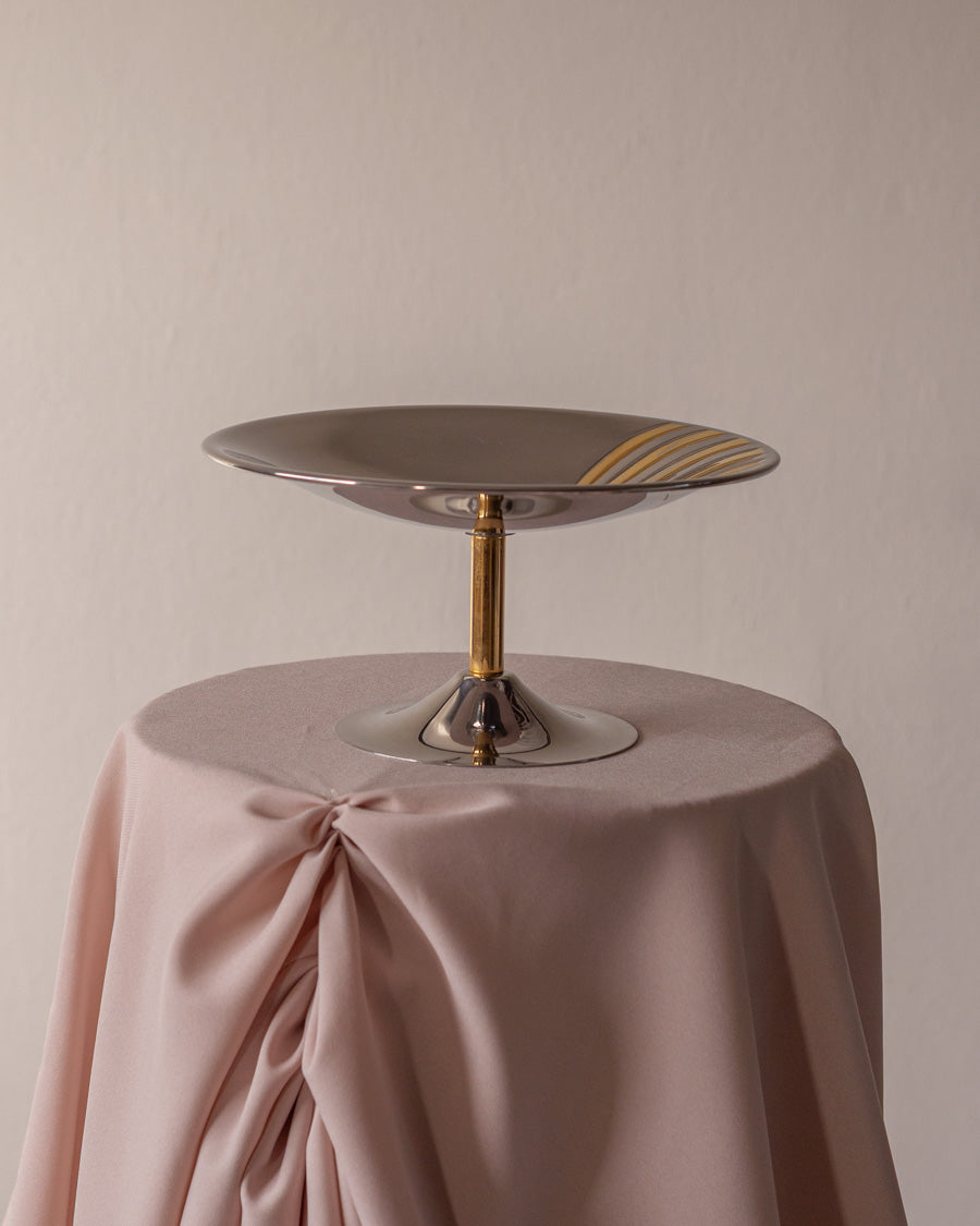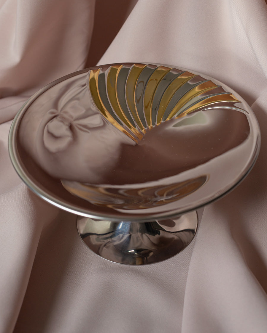 Vintažinis nerūdijančio plieno indas su paauksuota kojele ir dekoru vidinėje dalyje.
