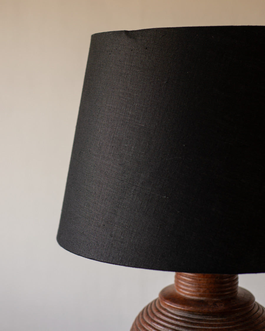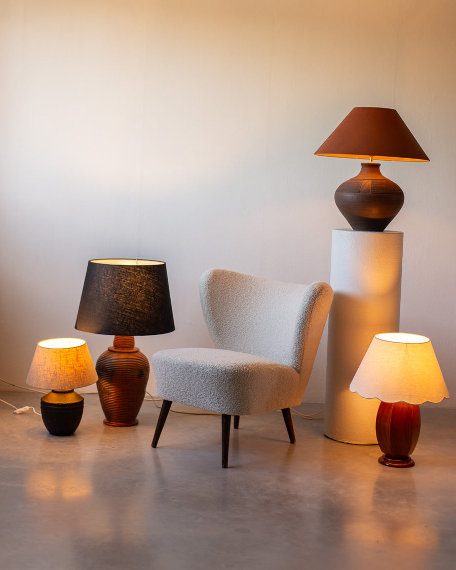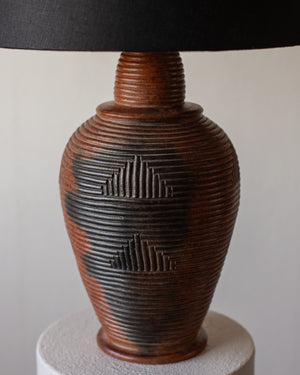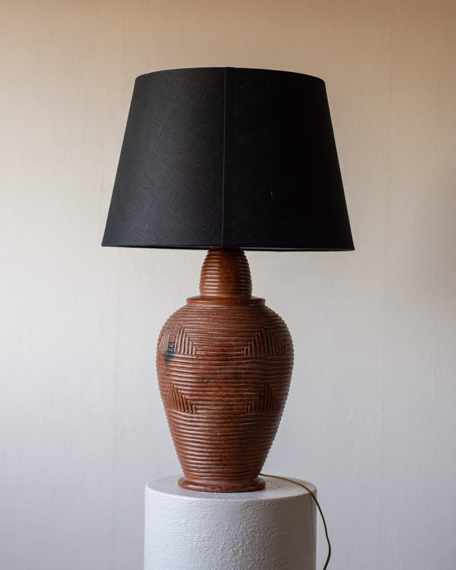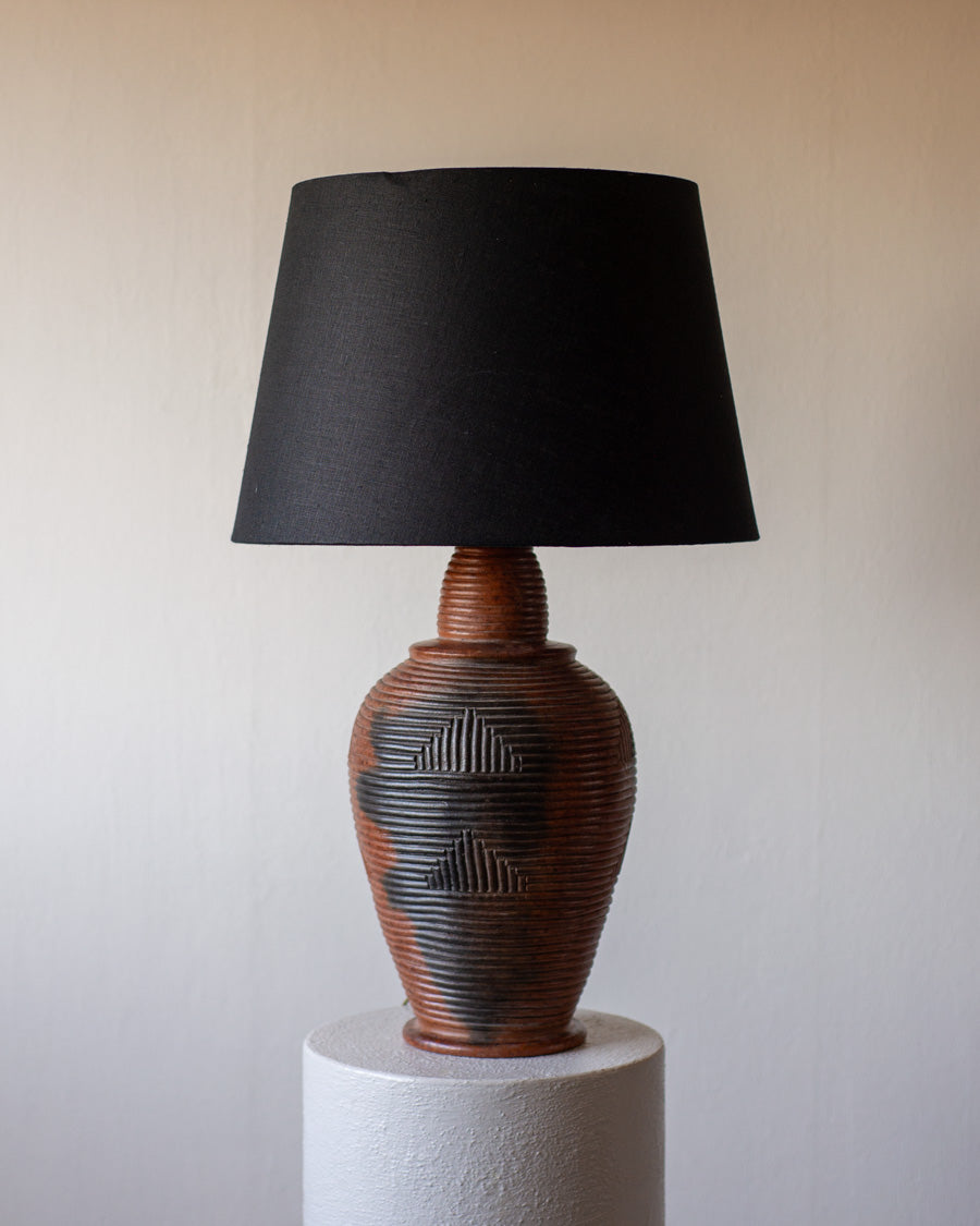 Vintažinis, banguotos tekstūros keramikinis šviestuvas, terakotos spalvos, su juodu akcentu.