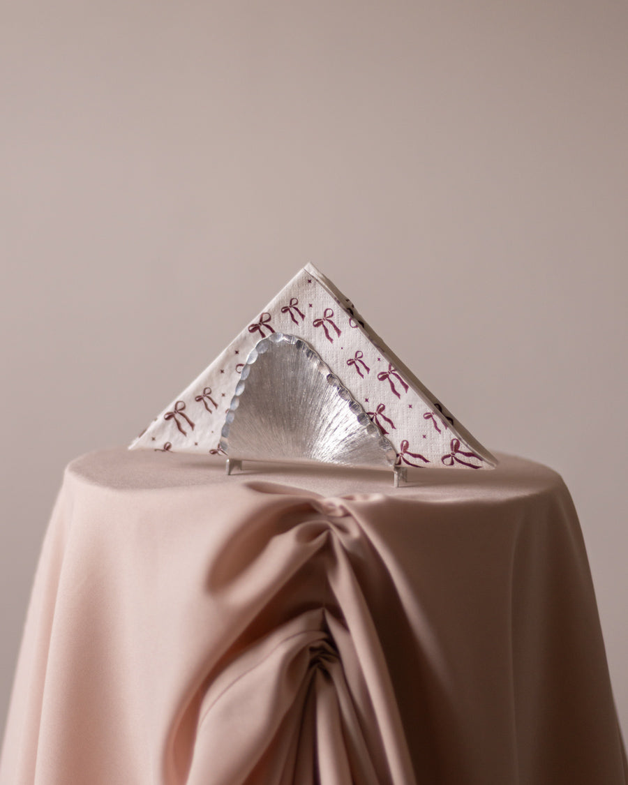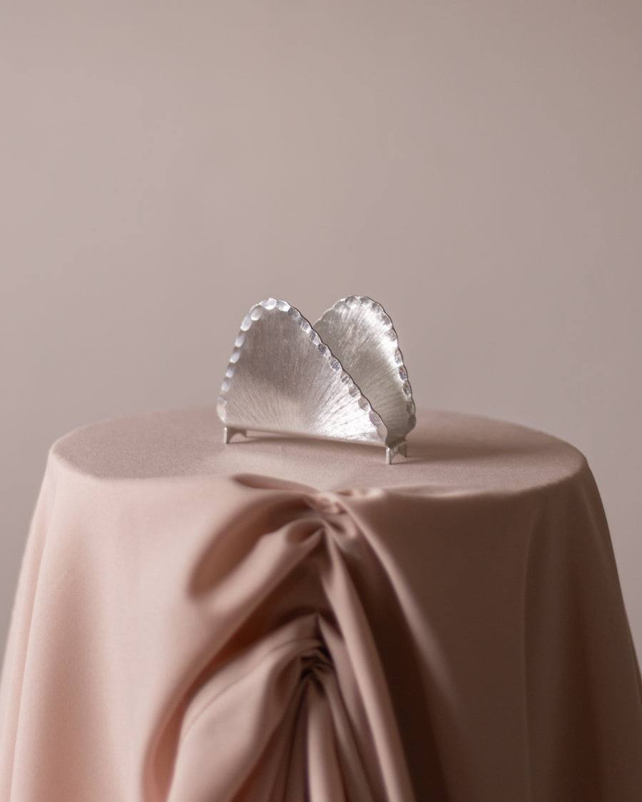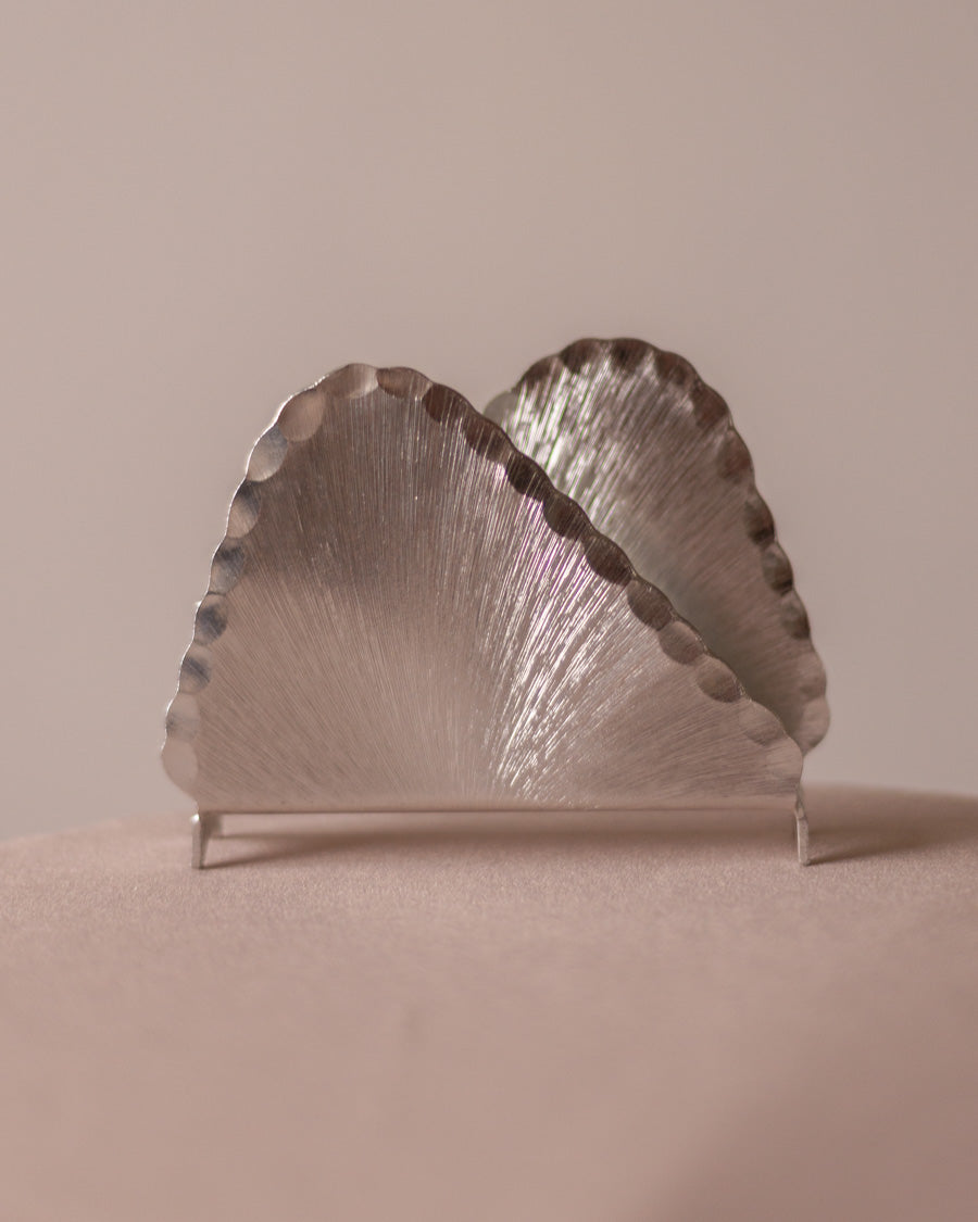 Raižyto, blizgaus aliuminio servetėlių laikiklis, atkeliavęs iš Italijos.