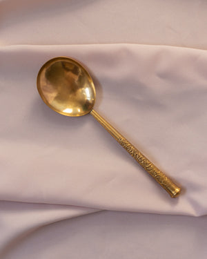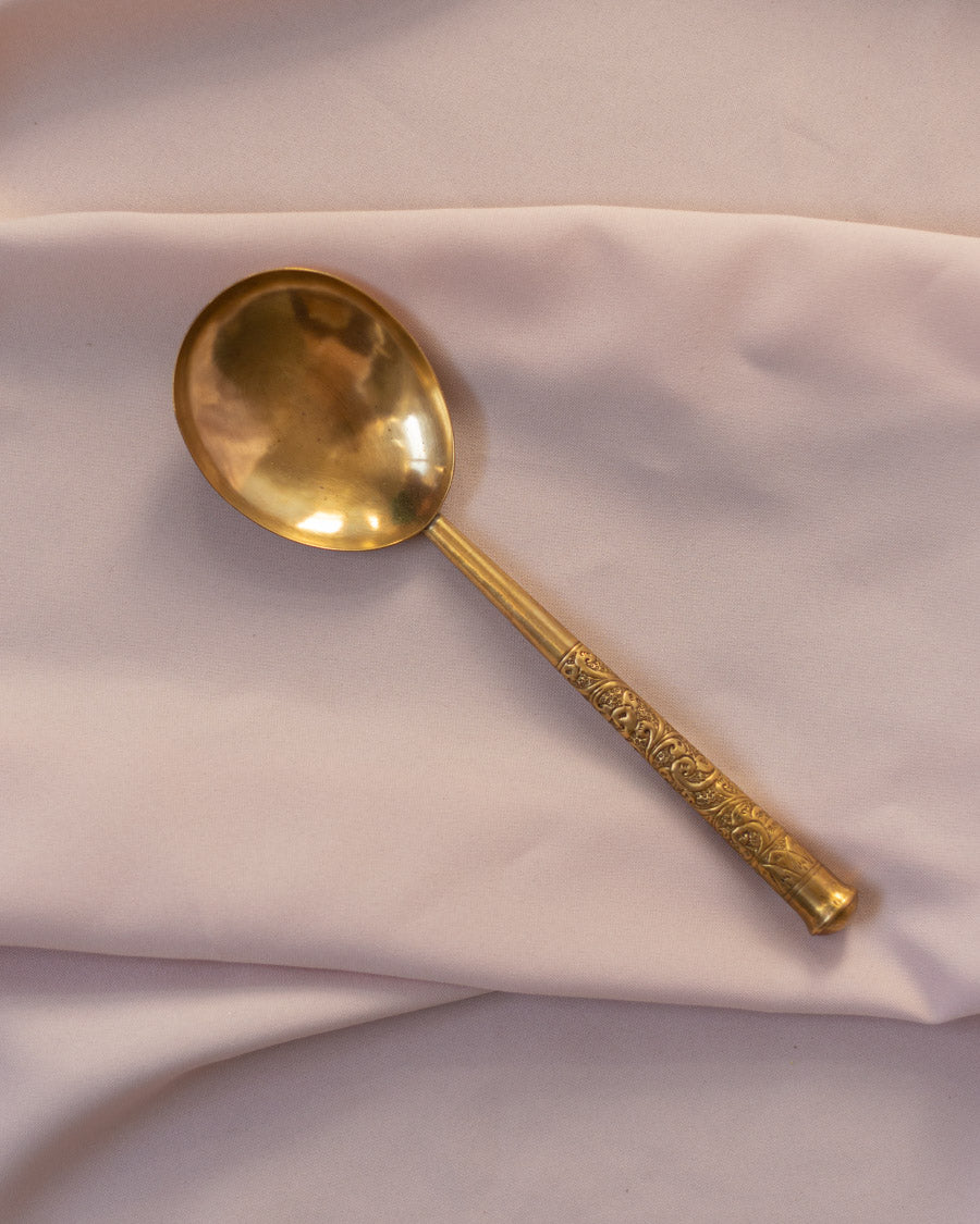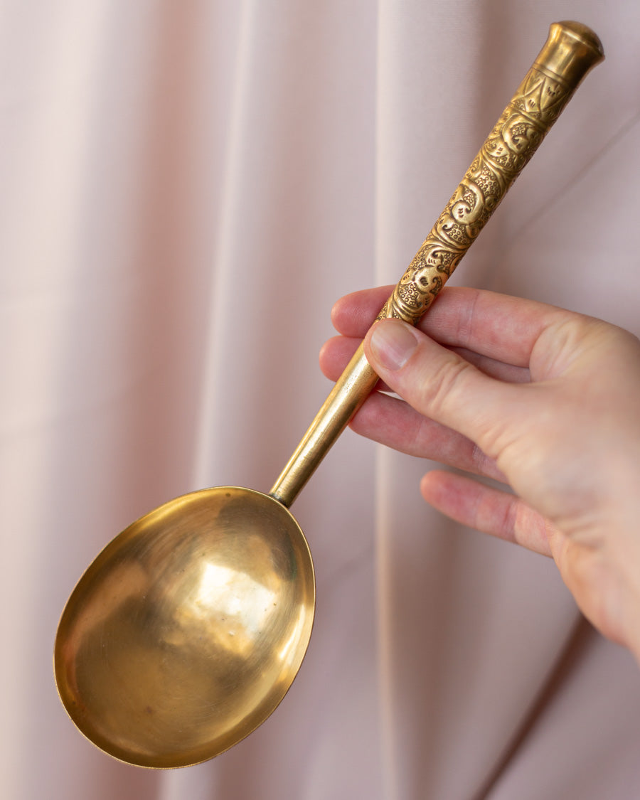 Vintažinis šaukštas, su dekoratyvia, raižyta rankena, pagamintas iš žalvario.