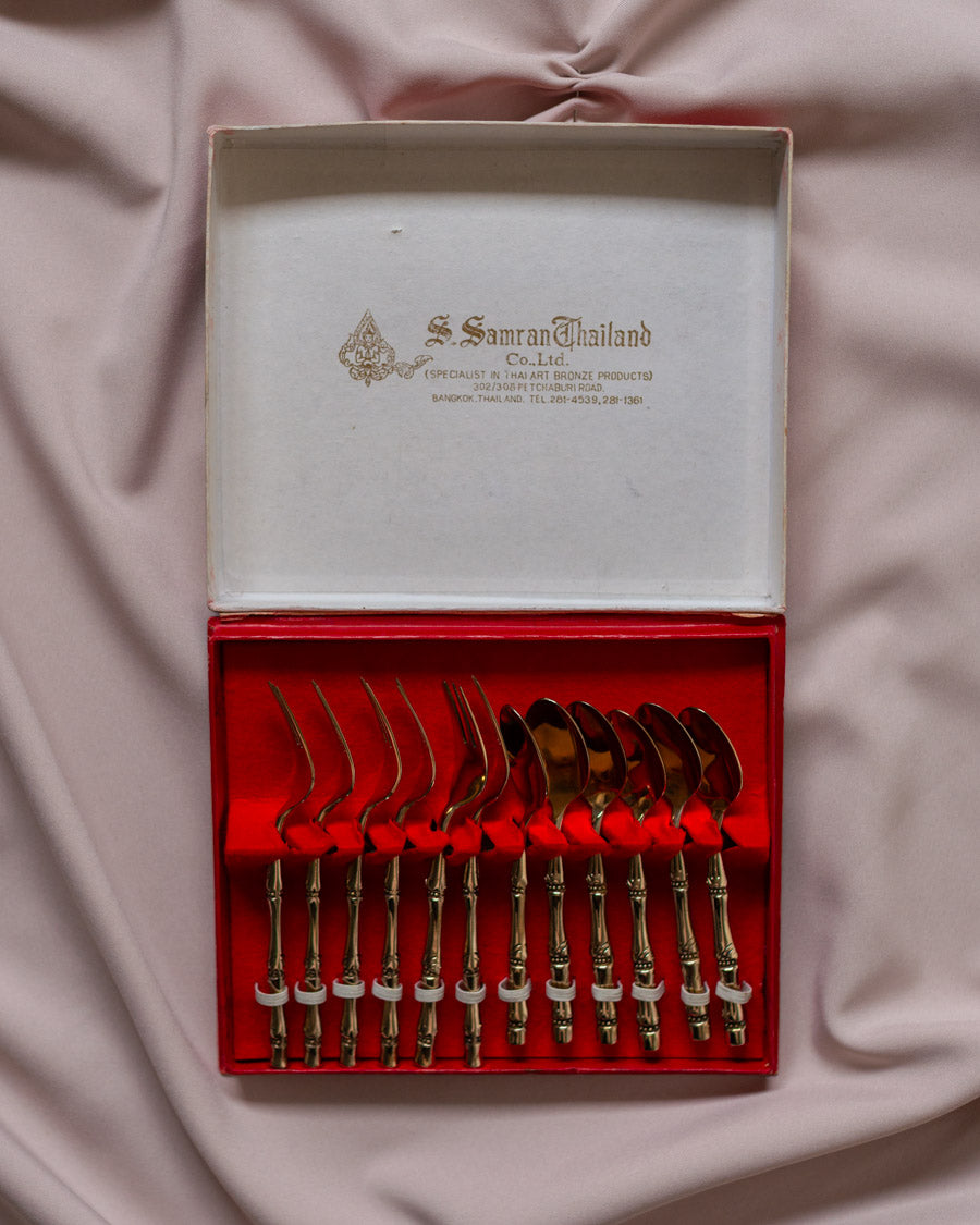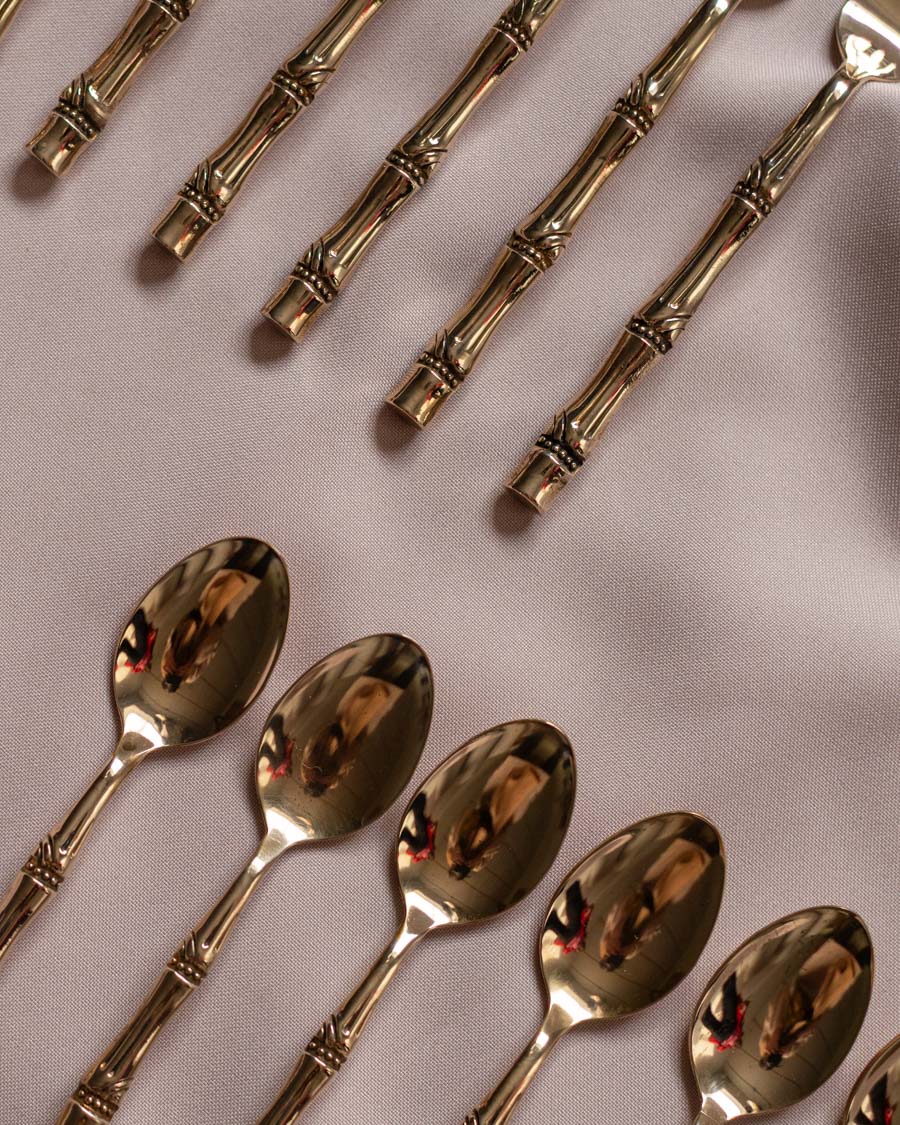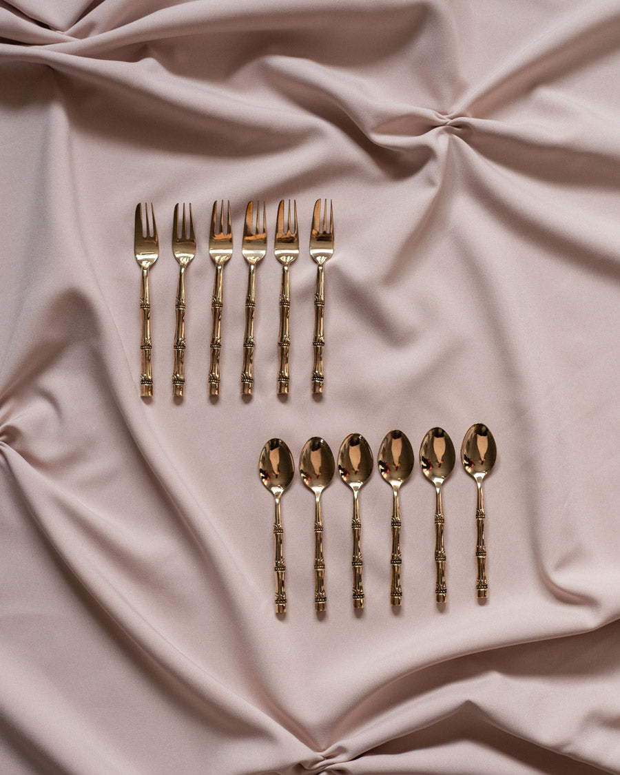 Vintažiniai, puošnūs žalvariniai desertų įrankiai - šakutės ir šaukšteliai.
