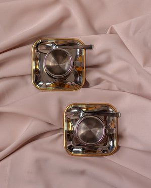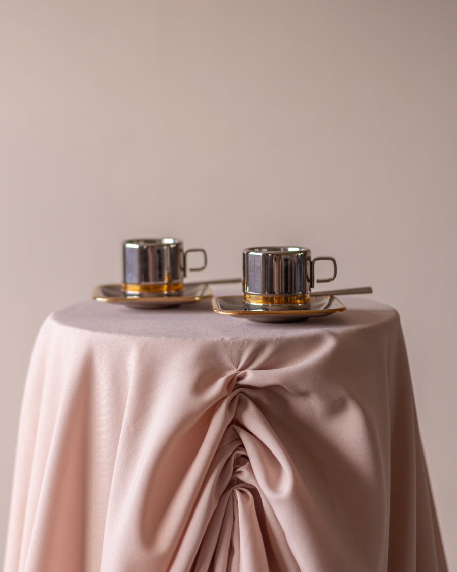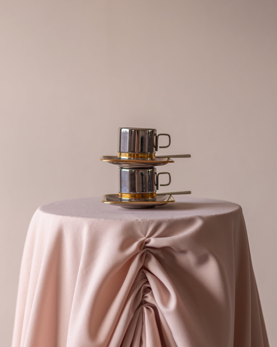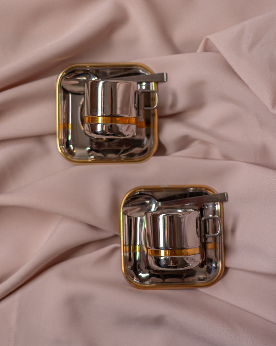 2 vintažiniai, nerūdijančio plieno puodeliai su aukso dekoru. Pagaminti 9-ąjame dešimtmetyje, italų gamintojo - Zini.